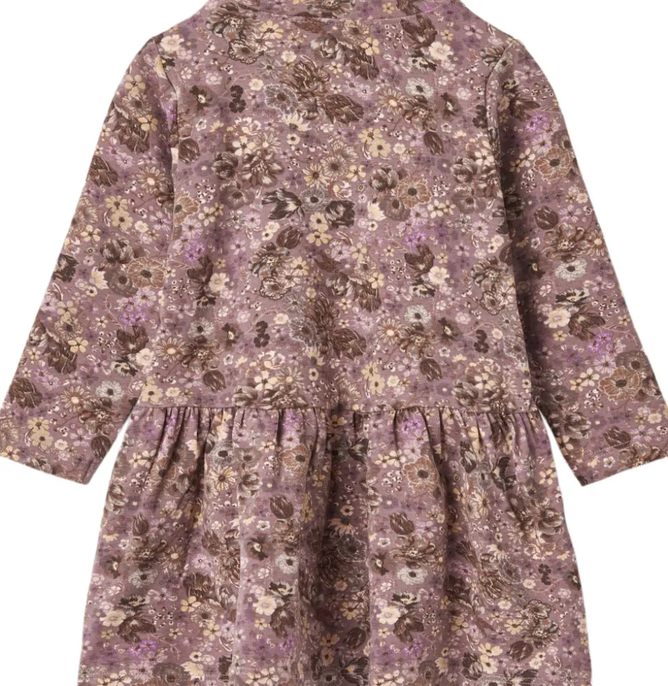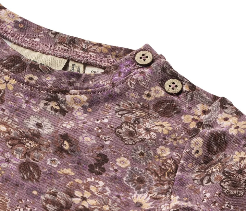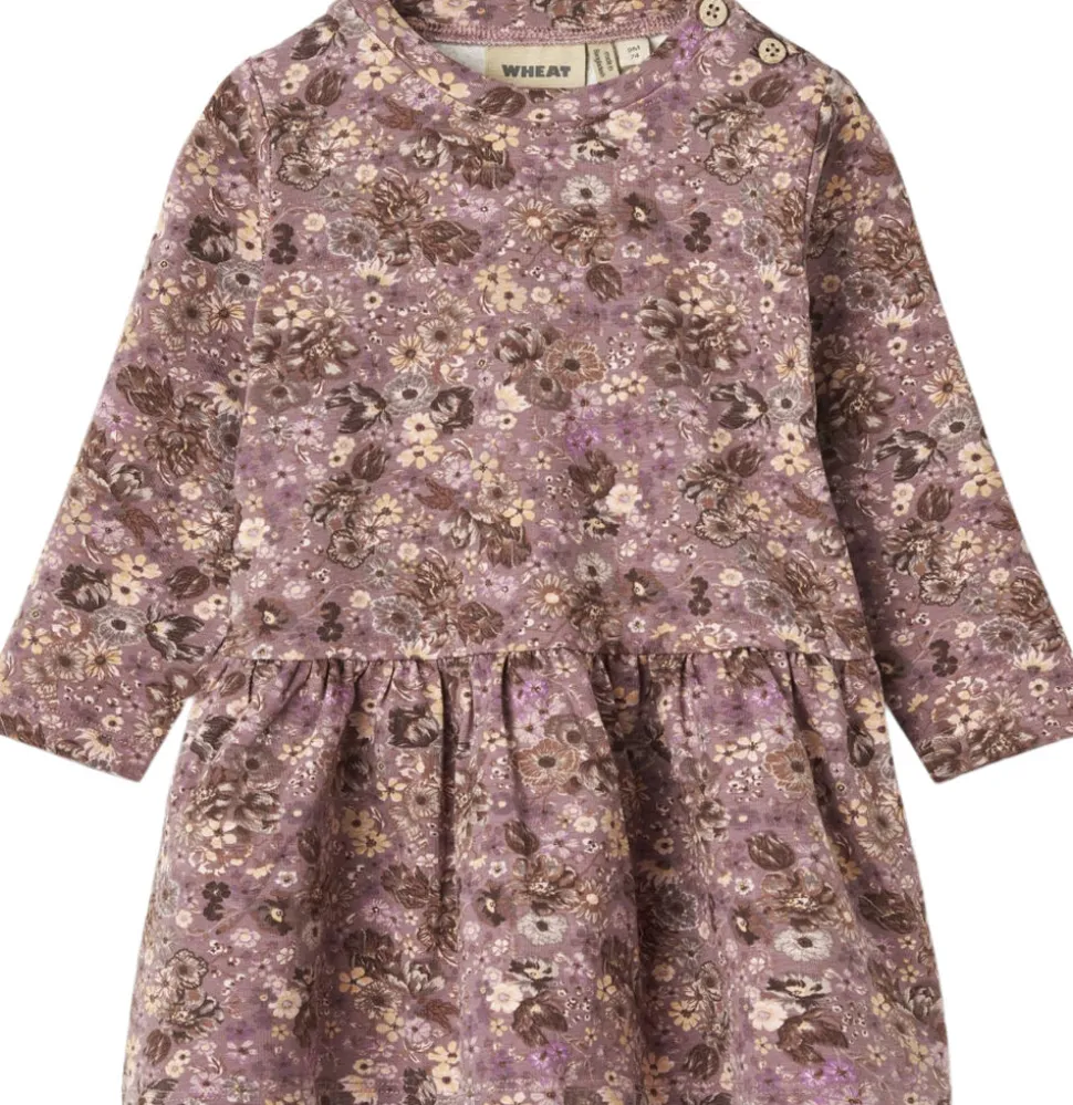 Wheat Langærmet jersey kjole i blød økologisk bomuld til din baby. – Løs pasform – Længde: Til knæene – Overskæring med bærestykke under taljen – Trykknapper på den ene skulder – Vidde i skørtet – Håndtegnet blomsterprint Wheats jersey kjoler er designet til at sørge for god komfort og bevægelsesfrihed. Denne kjole har en løs pasform, som gør den nem og behagelig for dit barn at have på. Kjolen har en flatterende cutline med læg, som giver kjolen god volumen. Kjolen er perfekt til efterårs- og vintermånederne og kan eksempelvis styles med et par leggings og en langærmet T-shirt under eller sammen med en cardigan eller pullover. Kjolerne fås i smukke farver og prints, som er håndtegnet af Wheats in-house designteam. Sammensætning: – Oeko-Tex certificeret – 92% Økologisk bomuld, 8% Elastan