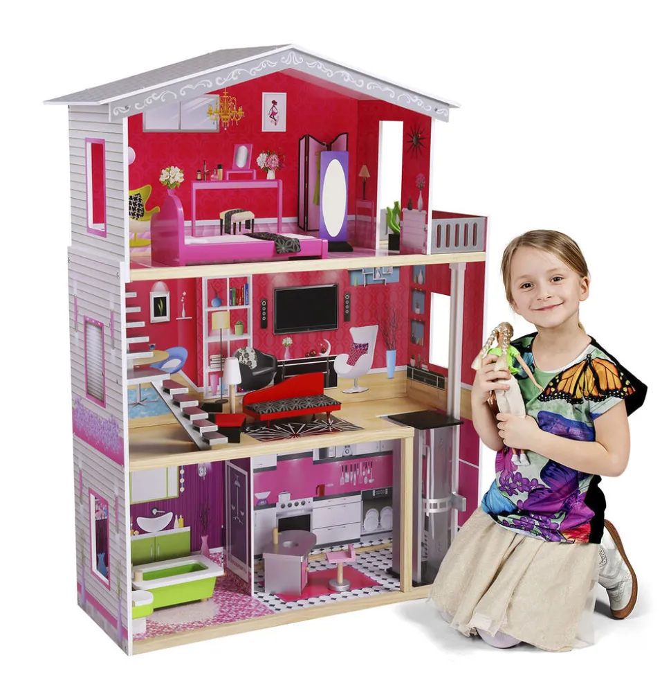 Kæmpe mannequindukkehus i træ Fuldt møbleret og solidt kvalitetsdukkehus i 3 etager Måler 115×82. 5×32 cm Uden dukke