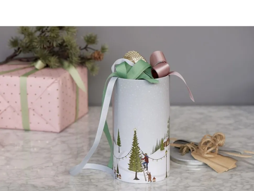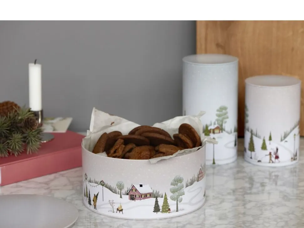 Kagedåse af metal med eventyrlige vintermotiver. Serien Vinter er skabt i samarbejde med designer Dorthe Mathiesen. Hendes motiver med den karakteristiske grafiske streg og lyse, nordiske pastelfarver afspejler stemningen i de hyggelige vintermåneder og fortæller historier fra de små samfund om leg i sneen, stemningsfulde vinterlandskaber og samvær med familie og venner, som beskueren kan hoppe ind i og selv bygge videre på.