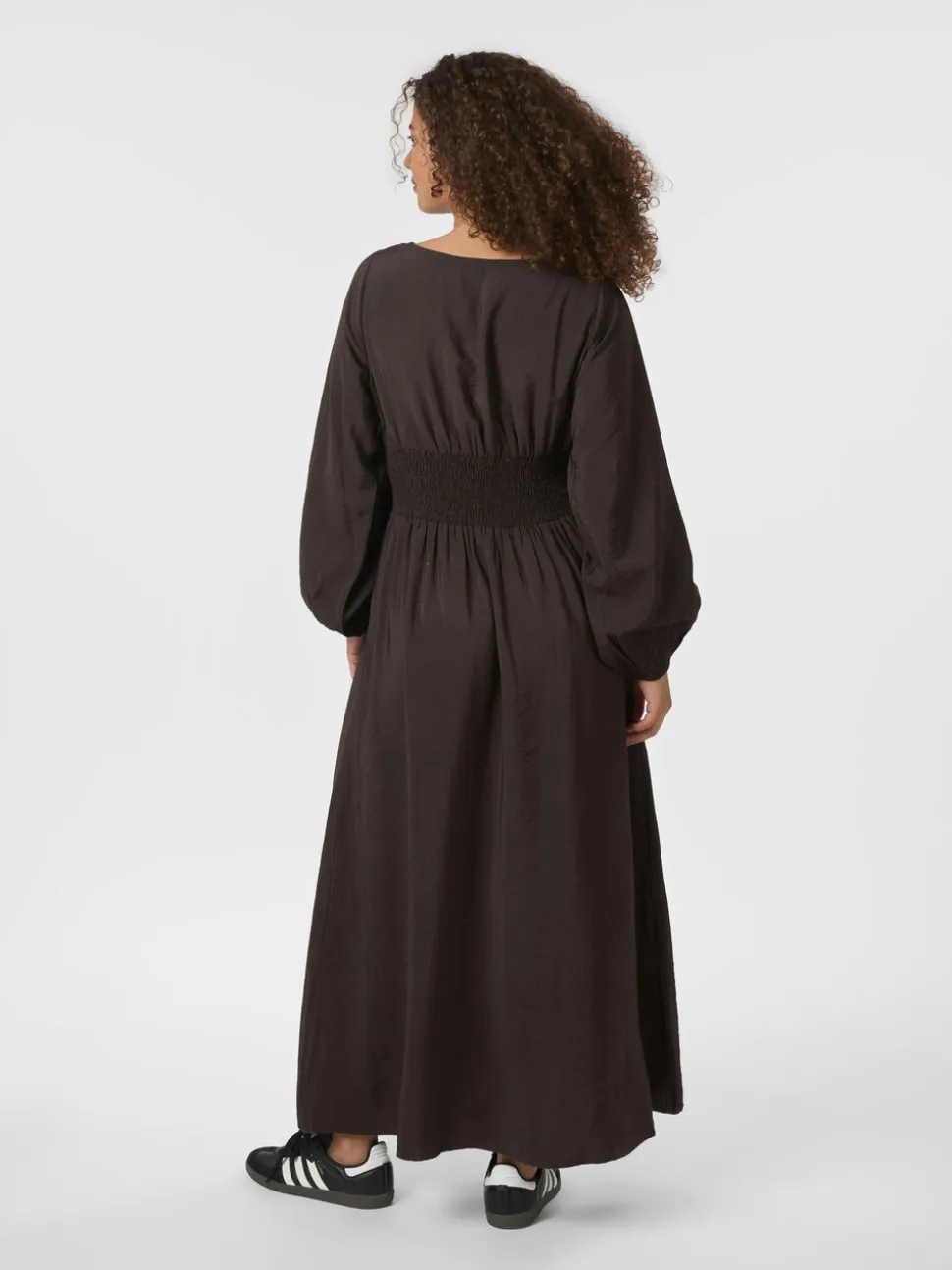 Fin langærmet kjole med en masse læg i taljen. Bagpå er der smock så den er komfortable at have på, og halsen har en feminin bådudskæring. Modellen er 176 cm og er iført en str. 36.