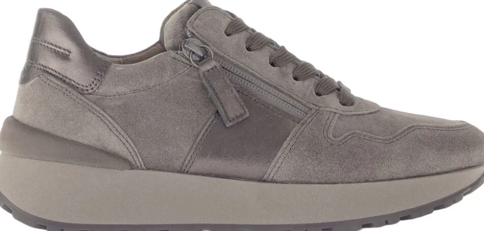 Sneakers fra Gabor i en lækker ruskindskvalitet med metalliske detaljer, der giver en flot effekt. Derudover har skoen snørebånd på fronten, en lynlåsdetalje på ydersiden samt en præget sål for et sporty udtryk.