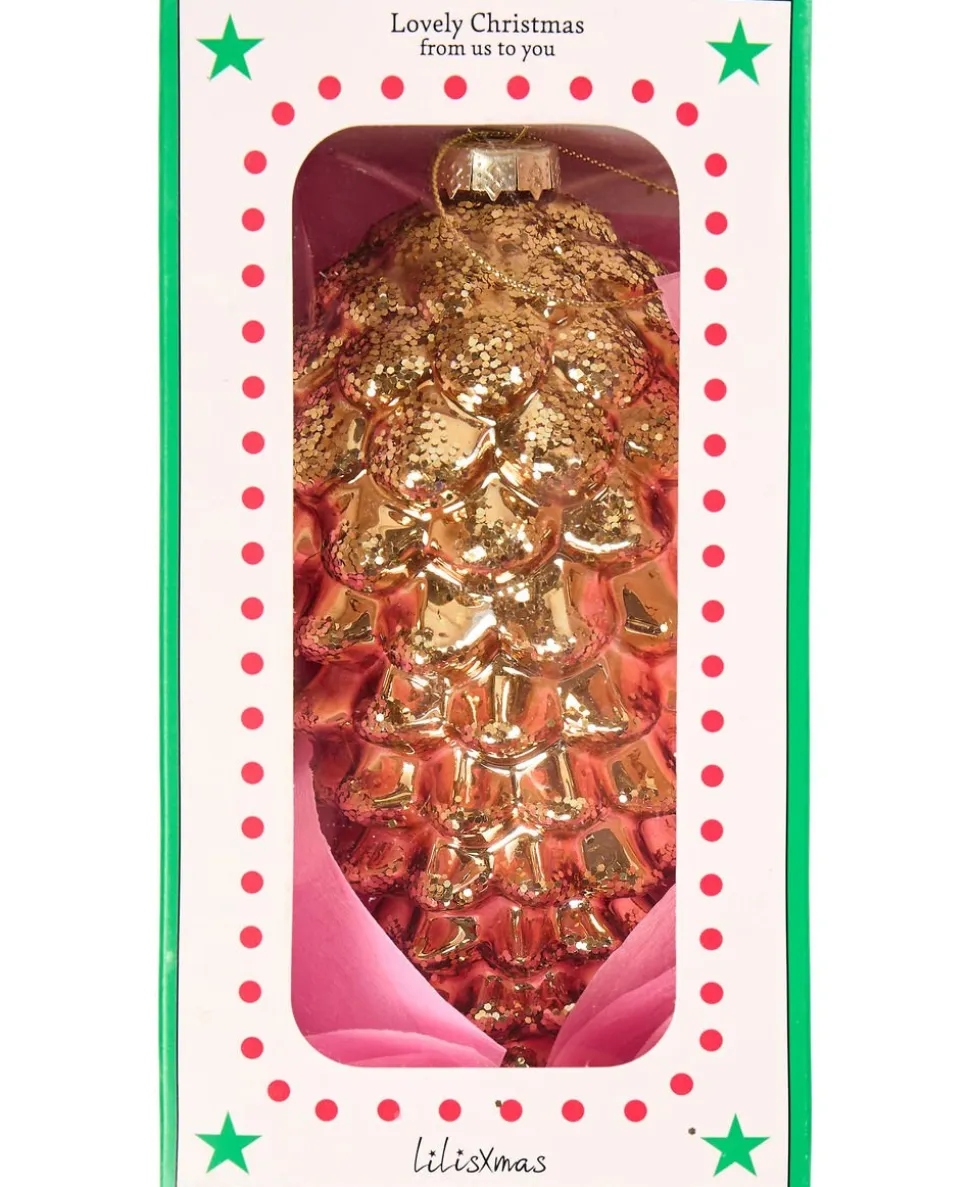 Kogle fra LiLisXmas i glas med det fineste glimmer. Koglen har en tynd tråd, så den kan hænges på juletræet eller pynte i hjemmet. Smuk julepynt, der fås i flere fine farver og størrelser.