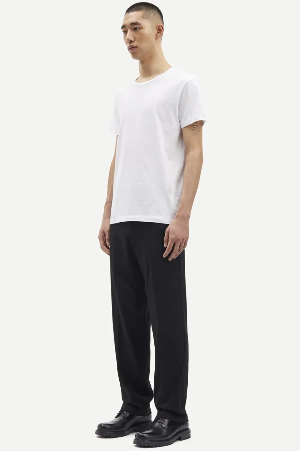 T-shirt med rund hals og en jævn stikning på indersiden i nakken og dobbeltstikninger ved manchetter og kant. En uundværlig basisstyle.