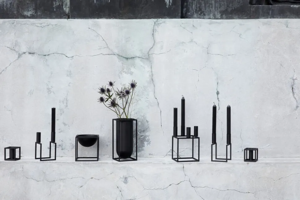 Kubus 1 lysestagen i sort er fremstillet i støbejern og tegnet af Mogens Lassen i 1962. Lysestagen fås i hvid, sort, bruneret kobber, nikkel samt messing. Med skarp fornemmelse for nutidens funkisstil designede Mogens Lassen i 1962 de ikoniske Kubus lysestager, dengang forbeholdt familien og de nærmeste arkitektvenner. Kubus fremstilles fortsat i Danmark, og har blandt arkitekter og designelskere opnået status som et moderne internationalt designikon. Rengøring: Vend stagen med lyseholderne ned ad, og placer den på en bageplade med bagepapir stående på lyseholderne. Sættes i en 75 grader varm ovn i 15-20 minutter. Stagen tørres herefter af med en fugtig klud. NB! Brug aldrig skarpe genstande eller kogende vand til at rengøre lysestagen med. Vi anbefaler, at du ikke lader lysene brænde helt ned i stagen, da dette kan medføre misfarvning eller skader på lakeringen.