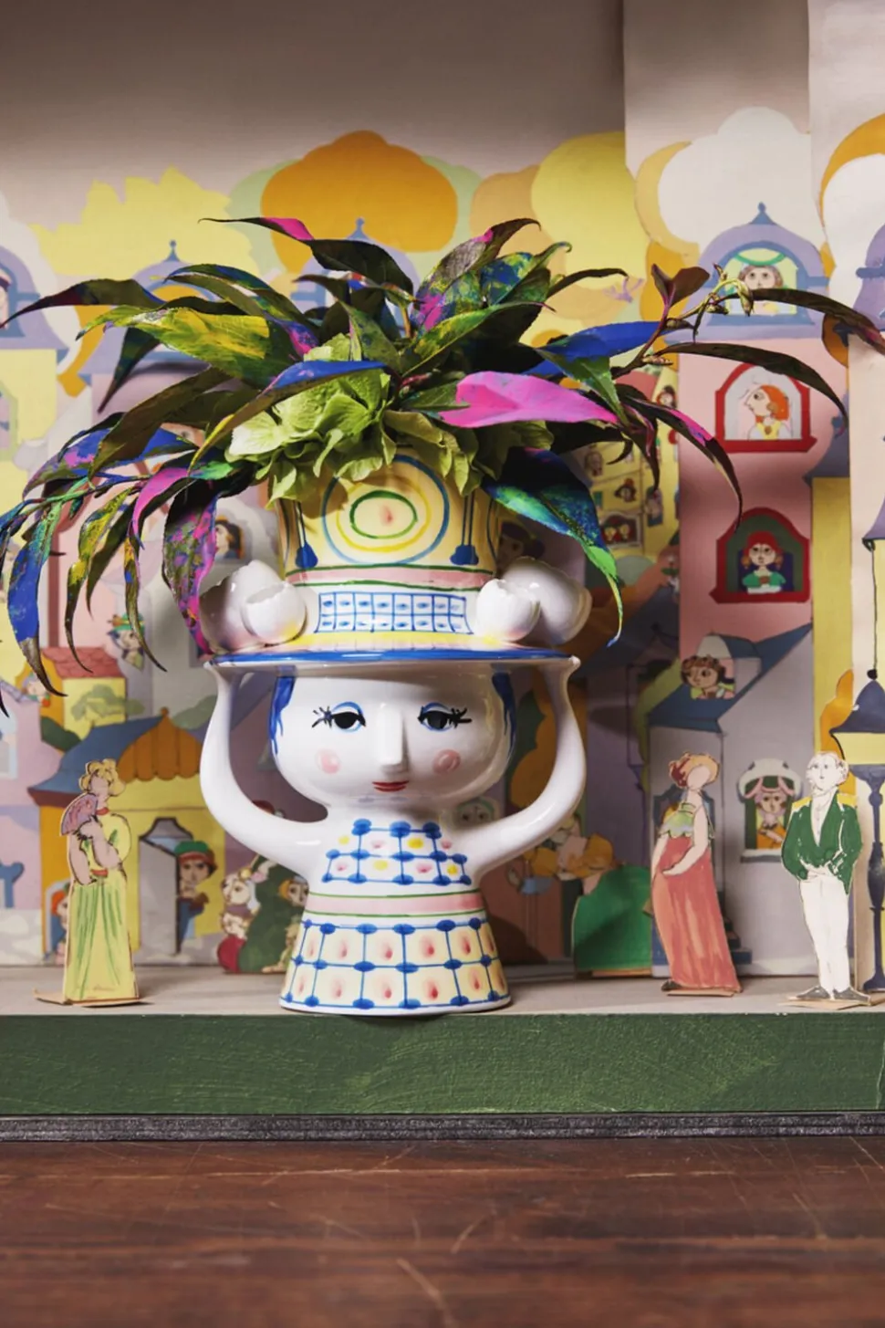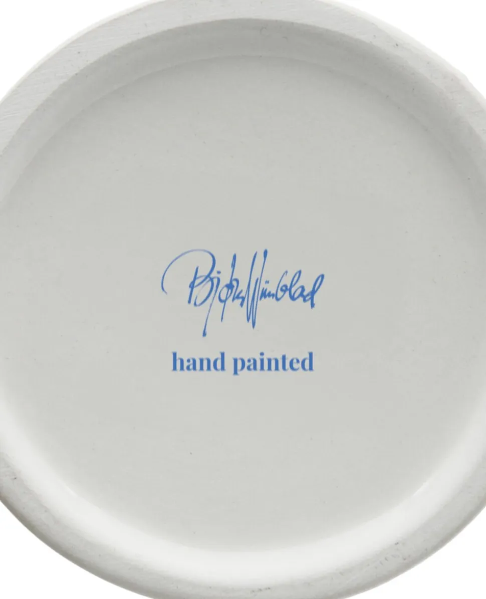 Invitér den nye hattefrøken indenfor, og lad hende skabe glæde i boligen med sine fine farver, finurlige detaljer og håndmalede dekorationer. Bjørn Wiinblad havde en forkærlighed for figurer med hatte, og arkiverne rummer utallige eksempler på, hvordan hatten dukker op igen og igen på nye, kreative og legende måder. Han designede selvfølgelig ikke små, fine pyntehatte. Nej, det var store voluminøse kreationer, der var både skulpturelle og avantgarde i deres udtryk præcis som i serien Lady with hat. Vasen i blankglaseret keramik på 20,5 cm er præget af den blå farve, og skørtets stringente linjer står i skøn kontrast til hattens cirkulære former. Som et lille tårn vokser hatten op mod himlen, mens den fine frøken balancerer den med sine hænder. Det giver vasen et finurligt og fantasifuldt udtryk perfekt til blomsterbuketten i den legende boligindretning. En anden detalje, der er gennemgående i serien, er de små, figurative blomster, der er placeret langs skyggen på hattene. Endnu en dekorativ detalje inspireret af Bjørn Wiinblads originale former og farver. Præcis som Bjørn Wiinblad repræsenterer Lady with hat alt, hvad der er skørt, skævt, kreativt og vidunderligt.