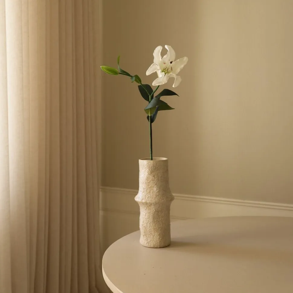 Denne hvide store liljeblomst har en Single åben blomst med sprøde hvide kronblade og et lysegrønt center, suppleret med en lukket knop ovenfor. Den lange, glatte grønne stilk når 68 cm i højden og er prydet med dybe grønne blade. Den store keramiske jordvase på billedet måler 30,5 cm i højden og 10 cm i diameter.