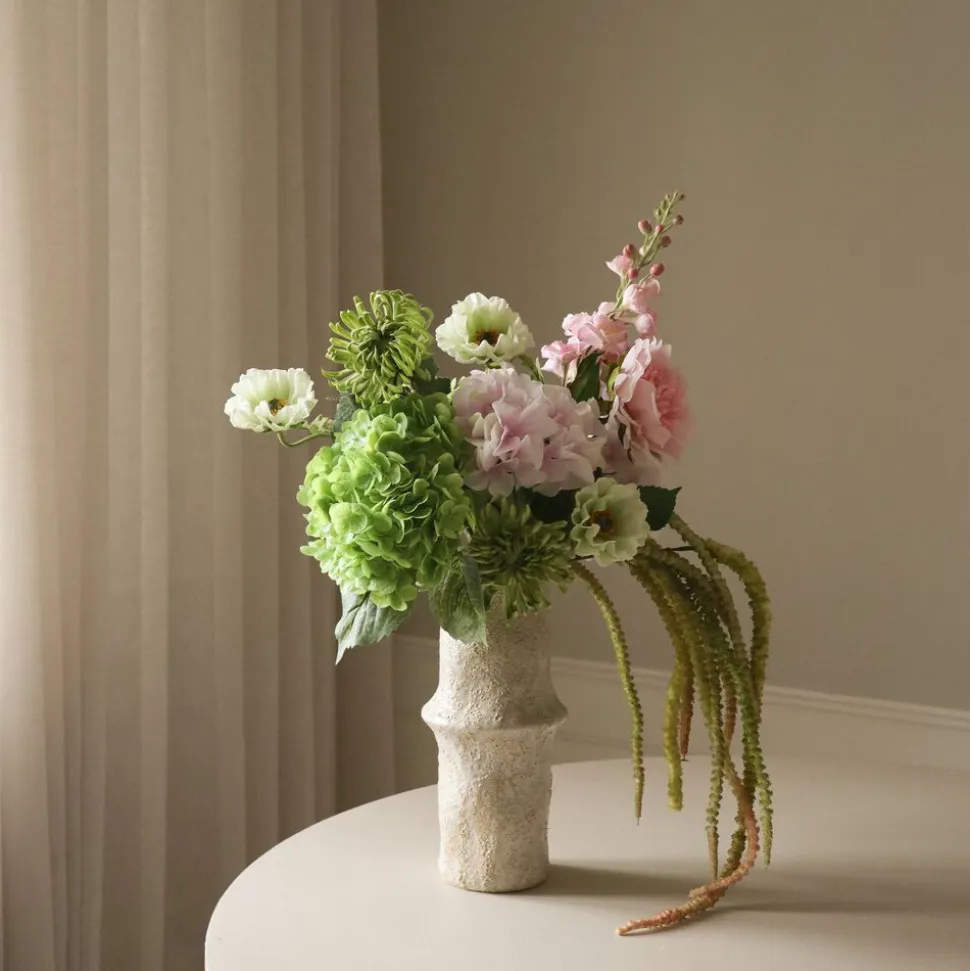 Denne hvide store poppyblomst har en Single blomst med bløde, rynkede kronblade, der skifter fra cremet hvid til en diskret grøn nuance nær midten, suppleret med en mørk central udholdenhed med gyldne accenter. Blomsten understøttes af et slankt, let tekstureret grønt skaft, som når en højde på 60 cm.ÊDen keramiske jordvase på billedet måler 30,5 cm i højden og 10 cm i diameter.