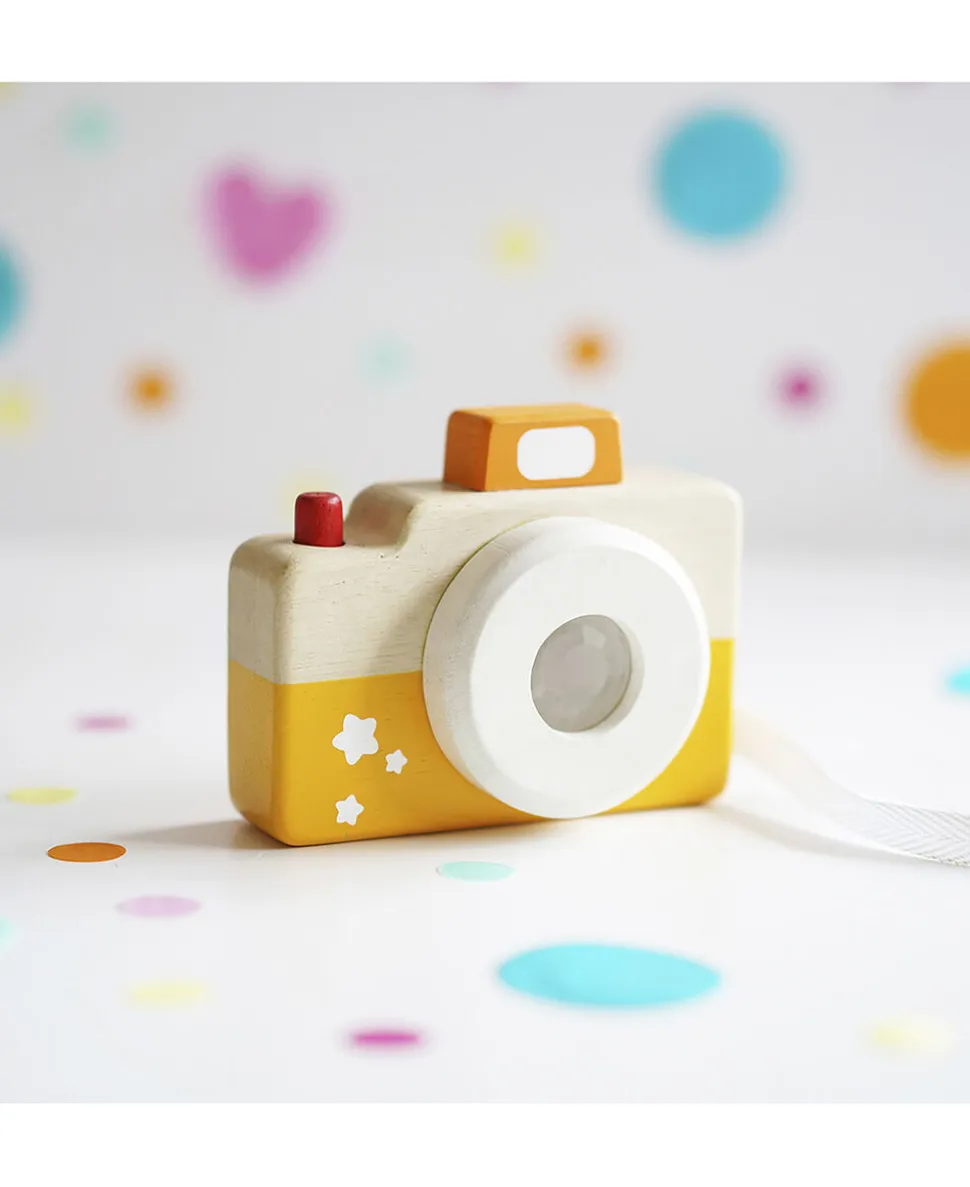 Sig appelsin! Et sjovt legetøjskamera med 4 kamera indstillinger, en roterende kameralinse med kaleidoskop og en knap til at “”tage”” billeder. Kameraet har en sjov og praktisk strop. Kameraet er lavet i fin gul, orange, rød farve og er lavet af naturlig gummitræ.