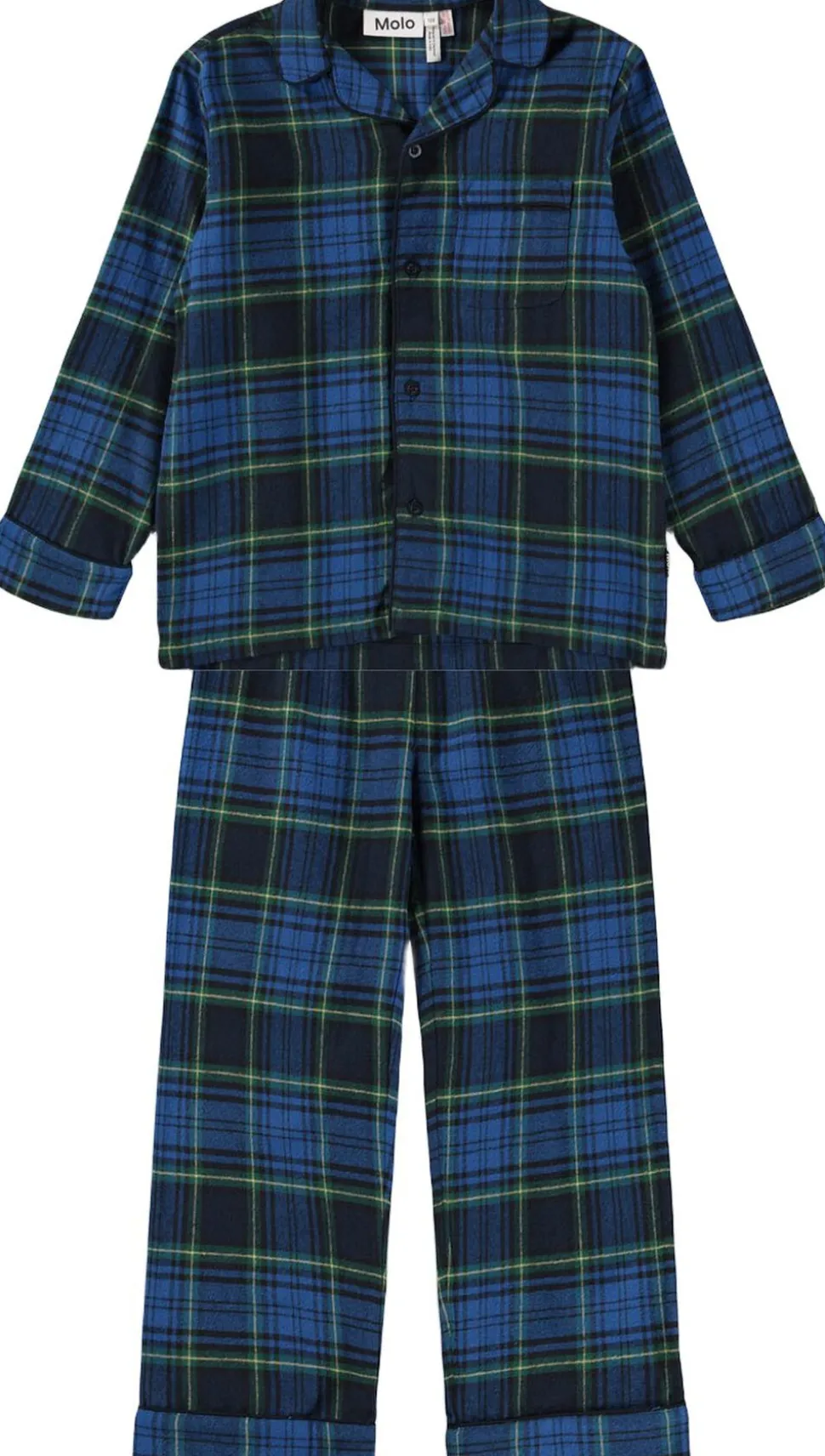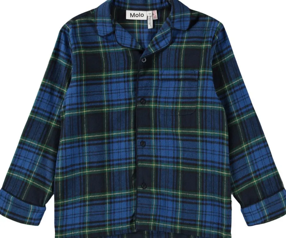 Denne pyjamas i økologisk bomuld fra Molo har lange bukser med elastisk talje og bindebånd. Toppen har lange ærmer, krave, en brystlomme og knapper ned langs fronten. Sættet har en almindelig pasform og sort piping i kanterne.