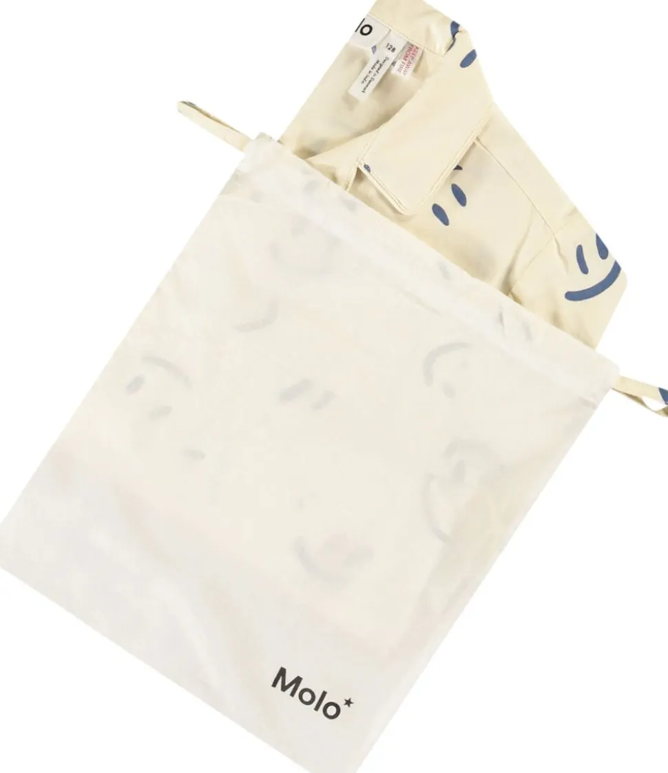 Råhvidt pyjamas-sæt med korte ærmer og ben i økologisk bomuld. Skjorten har en løs pasform, en krave med knapper ned langs fronten, en brystlomme og ombuk ved ærmerne. Shortsene har også en løs pasform, går til midt på låret og har elastik samt snøre i taljen. Sættet prydes af et allover print af smilende mørkeblå ansigter.