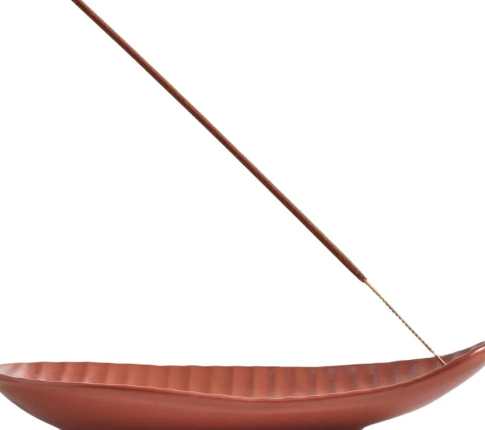 Røgelsesfadet er udført i glaseret terrakotta med en rillet overflade og en blødt organisk form, designet til at lade røgelsen brænde roligt og rent. Formen spejler LOEWE Home Scents duftlys og tilfører hjemmet et poetisk, sanseligt objekt.