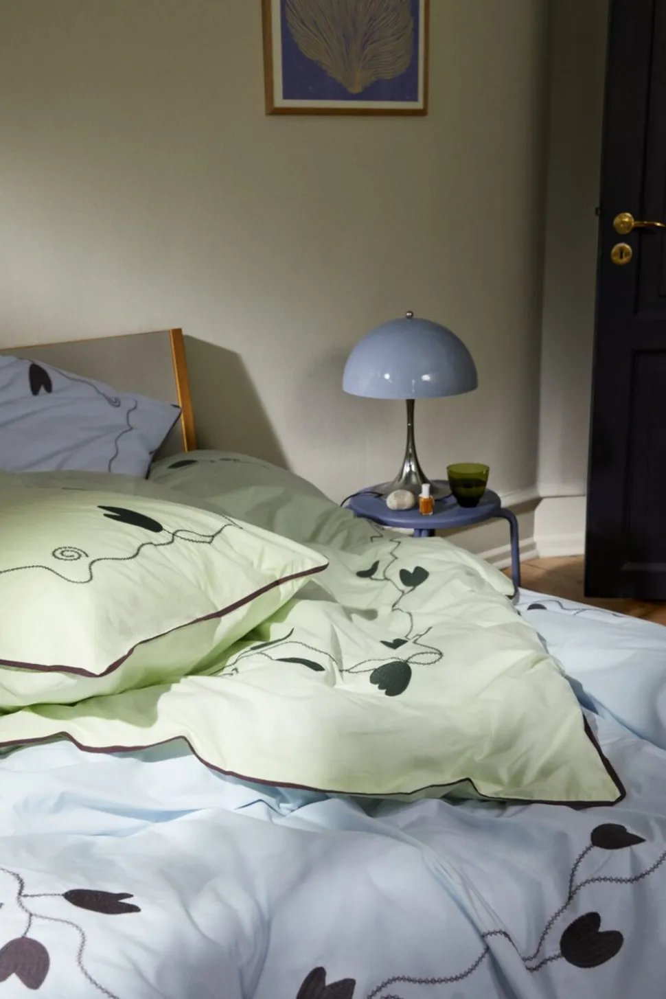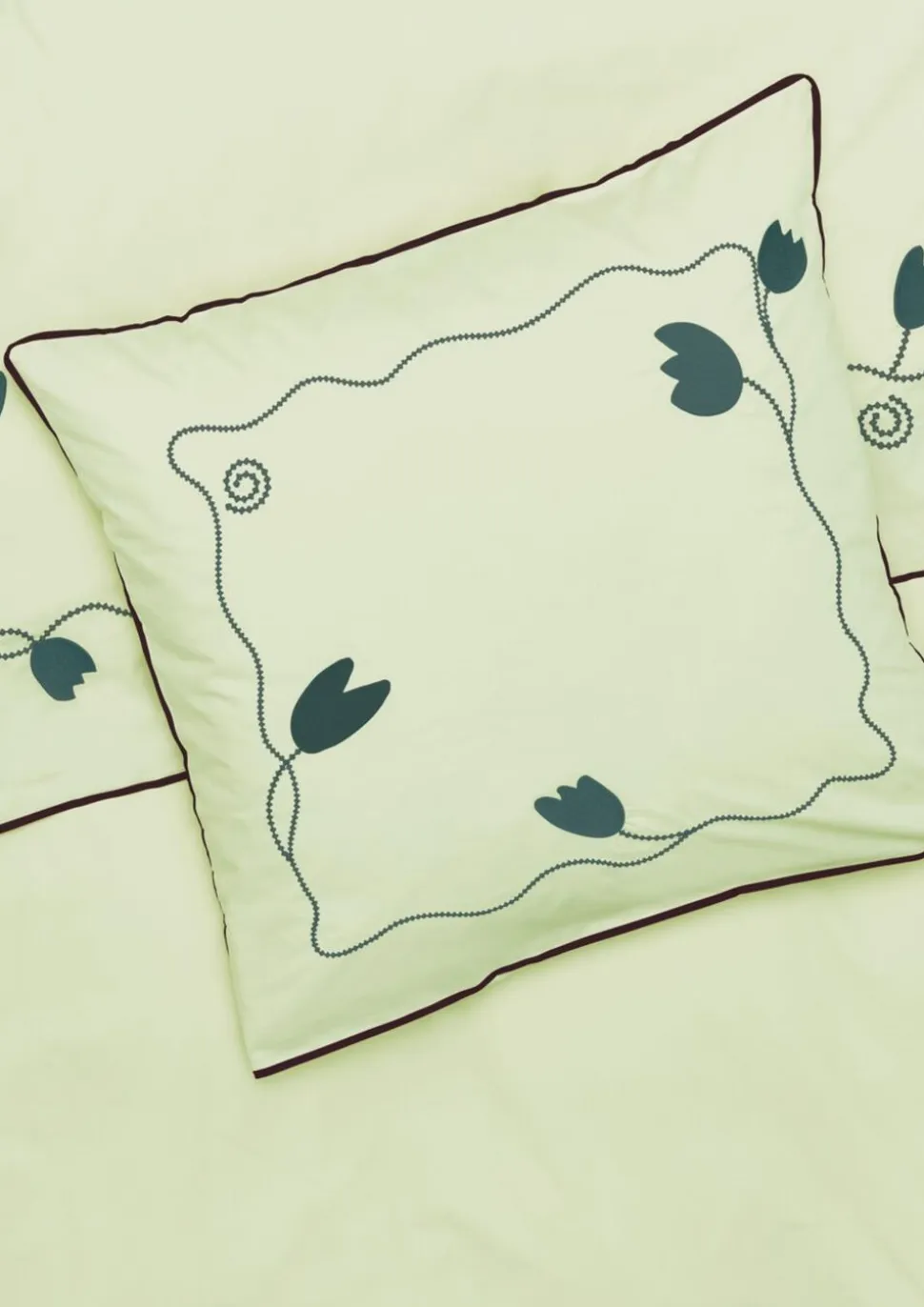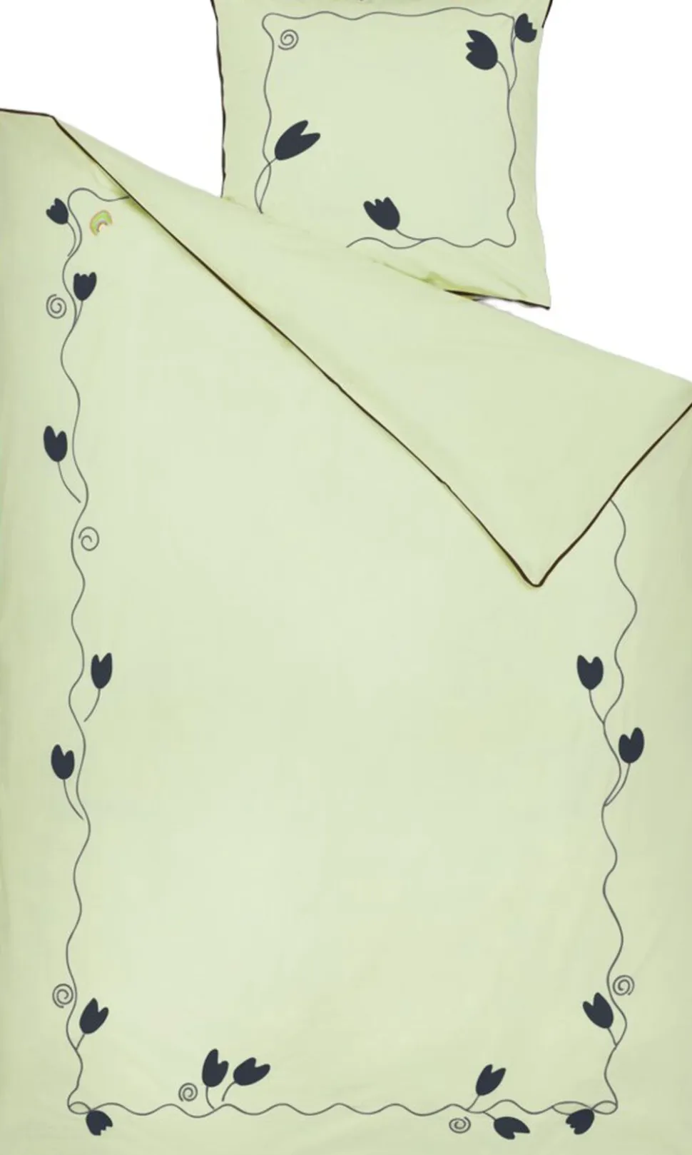 Mærk stemningen af bølgede blomsterranker i et opfriskende og trendy farveskema med masser af moderne kant. Med designsamarbejdet JUNA X KIMPOP fortolker de farverige personligheder Sofie Linde og Joakim Ingversen JUNAs drømmende univers i deres farverige, legende og unikke stil under navnet KIMPOP. Og med sengetøjet i Lollipop-kollektionen får du et fantastisk flow af broderede blomsterranker, der smukt og drømmende bølger sig ned over både pudebetræk og dynebetræk for en farvestrålende og fantasifuld stemning i soveværelset, i sofaen, i lænestolen, på din daybed, eller hvor du ellers hygger dig med din dyne og pude. Præcis ligesom JUNA ønsker Sofie Linde og Joakim Ingversen at skabe en hyggelig og uhøjtidelig følelse med deres tekstildesign, der inspirerer til store drømme i farverige omgivelser. Dette sengesæt til dyner med almindelig længde måler 140×200 cm og kommer i en sart lysegrøn prydet med broderede blomsterranker i mørkegrøn en både sofistikeret og sensuel farvekombination, der forstærkes af den fremtrædende piping hele vejen rundt langs kanten i en trendy bordeaux farve. Og du bliver selvfølgelig heller ikke snydt for Lollipops signaturregnbue, som du finder broderet i sin mangfoldige skønhed øverst til venstre på dynebetrækket. Lollipop-sengetøjet er fremstillet i 100% økologisk bomuld, der er GOTS-certificeret, så du lunt og trygt kan nyde en god nats søvn, og når du kommer helt tæt på, vil du ud over detaljerne med blomsterrankerne også virkelig kunne se og mærke lækkerheden i den tætte og fine bomuldspercale, der giver stoffet en blød og glat tekstur. Samtidig med at være ekstremt behagelig at sove i får du med percalevævningen også et meget slidstærkt og holdbart sengesæt i en eksklusiv kvalitet, som du kan have glæde af nat efter nat og år efter år. Pudebetrækket har kuvertlukning, mens dynebetrækket lukkes med knapper. Har du flere forskellige Lollipop-sengesæt fra JUNA, kan du lege med at blande de forskellige farver for at skabe lige præcis den følelse af cosy cocooning, der passer til dig og dit soveværelse. Med Lollipop og JUNA kan du gøre lige, hvad du drømmer om. (GOTS Organic Certified by Control Union, 1026087)