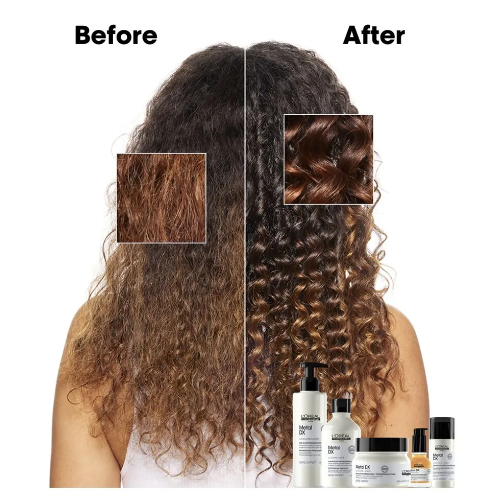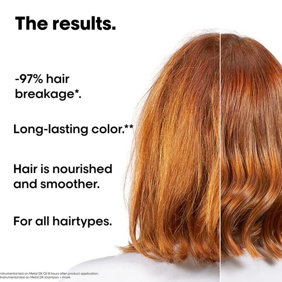 Dette sæt indeholder ministørrelser: Metal DX Shampoo 100ml + Metal DX Mask 75ml + Metal DX Concentrated Oil 30ml.