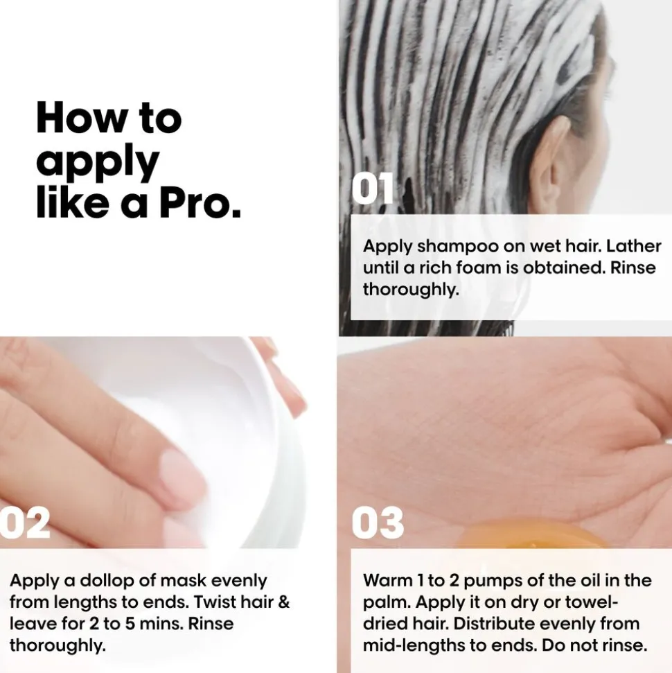 Sådan gør du: 1. Påfør shampoo jævnt i vådt hår. Skum op, indtil en fyldig skum er opnået. Skyl.