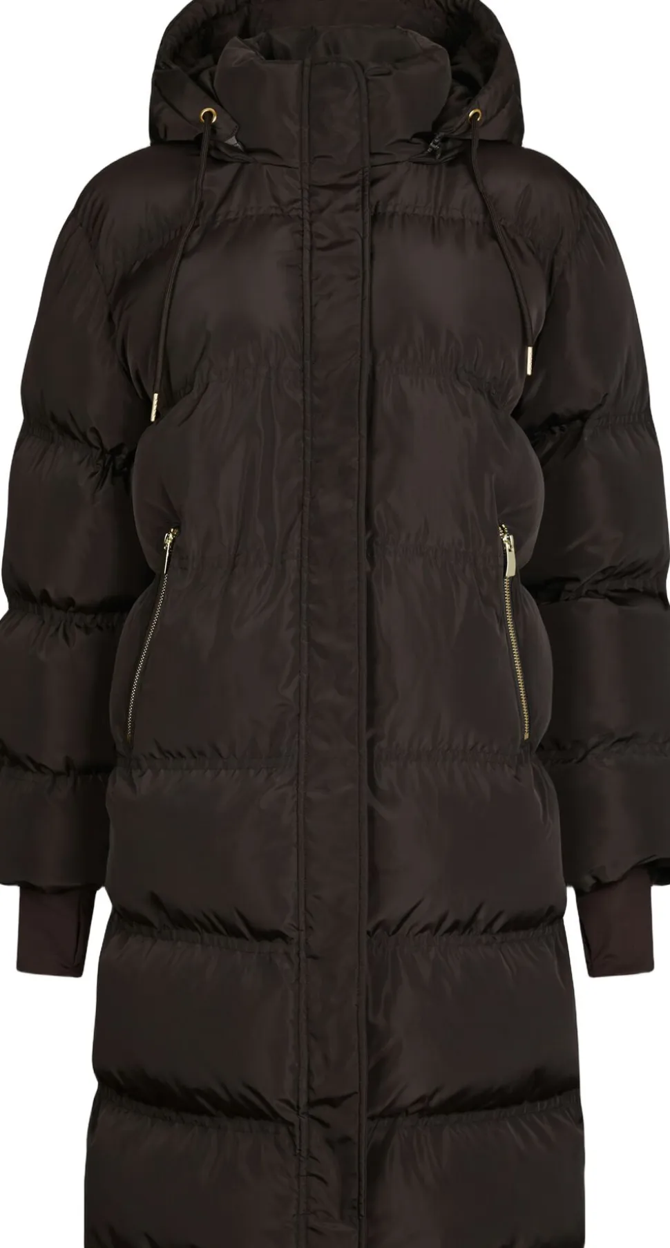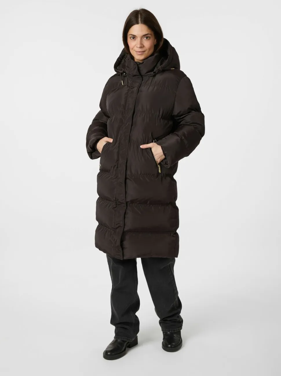 Lang, vatteret jakke med hætte. Jakken har en høj hals med aftagelig hætte, tovejs-lynlåslukning samt trykknapper og lange ærmer med vindfang. Den har forede sidelommer, der lukkes med lynlås. Pasformen er almindelig. Modellen er iført størrelse 36.
