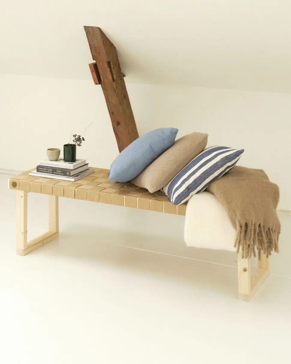 Bænk fremstillet af 100% rest træ samt med håndflettet sæde af OEKO-TEX Certificeret hør, som er med til at give et unikt udtryk. Alle bænke fra Wecycle Furniture er udelukkende dansk produceret.
