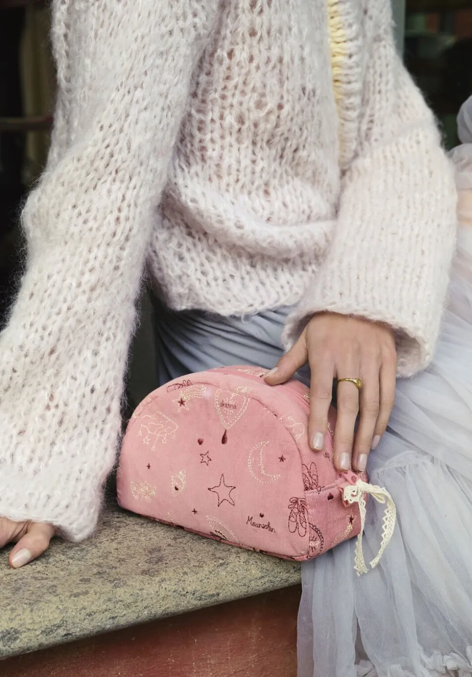 Mærk scenens fortryllende energi med denne makeup taske, der med sit mønster af stjerner, hjerter, halvmåner og lokkende vifter, bringer magi til din makeuprutine.
