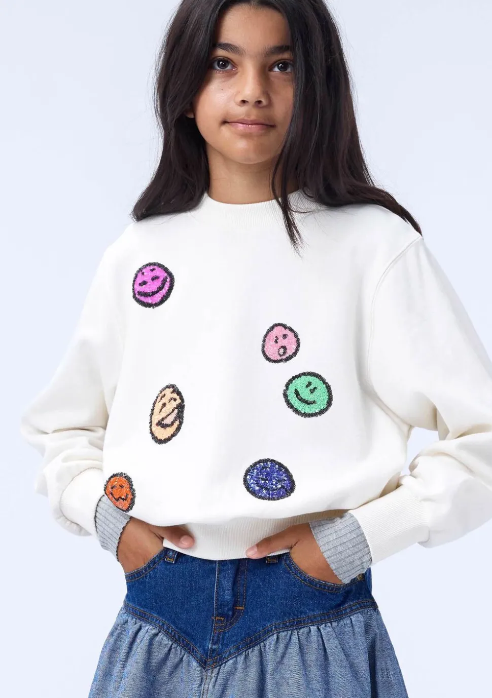 Denne råhvide sweatshirt fra Molo er lavet af økologisk bomuld med rund hals og ribkanter. Sweatshirten har en oversize pasform og er broderet med multifarvede paillet-ansigter på fronten.