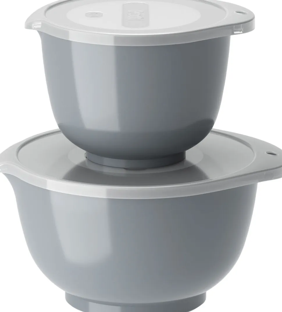 Margrethe røreskålesæt fra Rosti i 2 af de mest anvendte størrelser. Sættet indeholder 1,5 + 3 liter Margrethe-skåle med tilhørende låg. Margrethe-skålen er den klassiske røreskål med det gode greb, den praktiske hældetud og den skridsikre bundring. Den nye version af Margrethe-skålen er fremstillet i Durostima®, et genanvendeligt plastmateriale. Skålen er nu endnu stærkere og mere brudsikker, og med det nye materiale kan den også tåle mikroovn og fryser. Margrethe-skålen er velegnet til såvel tilberedning som servering, og tilkøbes der låg, er røreskålen omdannet til en praktisk opbevaringsskål.