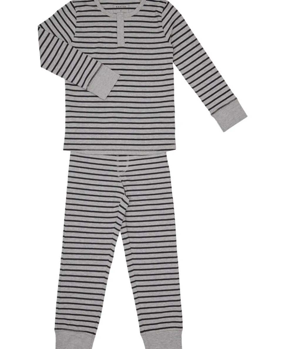 Stribet pyjamas fra BAKITO by Magasin i blød, økologisk GOTS-certificeret bomuldskvalitet. Pyjamassen består af en bluse og et par bukser. Blusen er enkel i modellen med lange ærmer, en rund halsudskæring samt trykknapslukning på fronten. Bukserne er ligeledes enkle i modellen en bred elastik i taljen samt syningsdetaljer på fronten. En rigtig flot pyjamas af den bedste kvalitet. Fås i flere smarte farver.