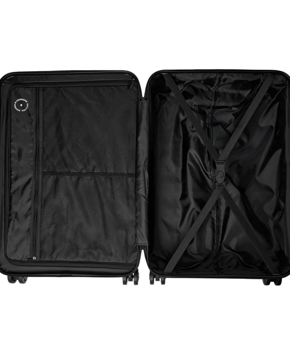 Kuffert fra Magasin du Nord Collection i en kvalitet af 100% ABS-plast, der sikrer en robust skal. Kufferten er fuldt foret i genanvendt RPET Polyester og består af et stort rum med lynlåslukning, flere indvendige lommer samt en indvendig strop, der sikrer at kuffertens indhold er fastgjort. Derudover har kufferten en TSA-kompatibel lås, en diskret logodetalje på fronten, et håndtag i side og top. Fire robuste og lette 360° spinnerhjul til nem manøvrering, dækkene er lavet i et holdbart materiale, der ruller jævnt på alle overflader. Samt et flertrins teleskophåndtag. 74x53x29 cm