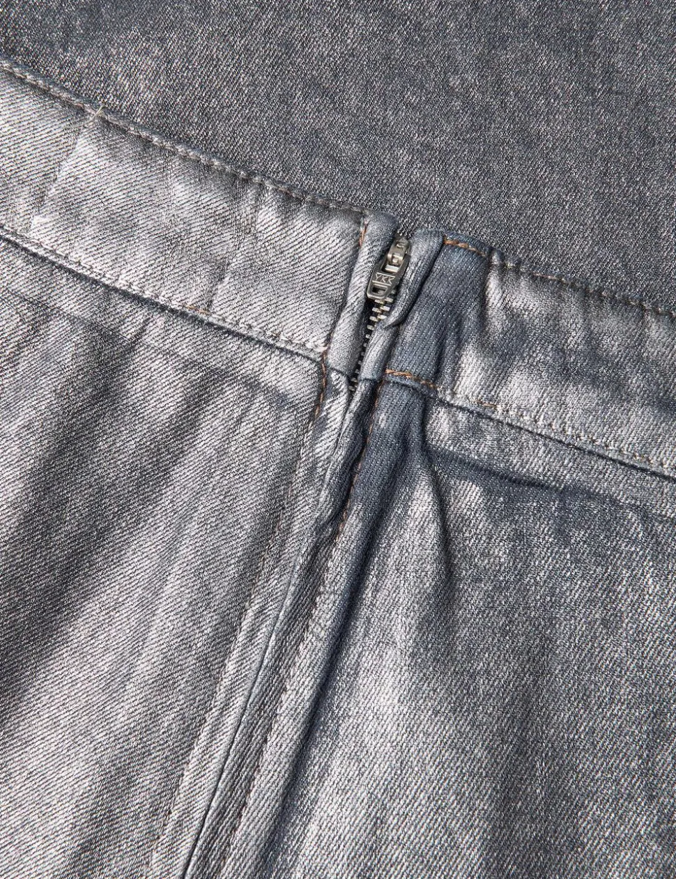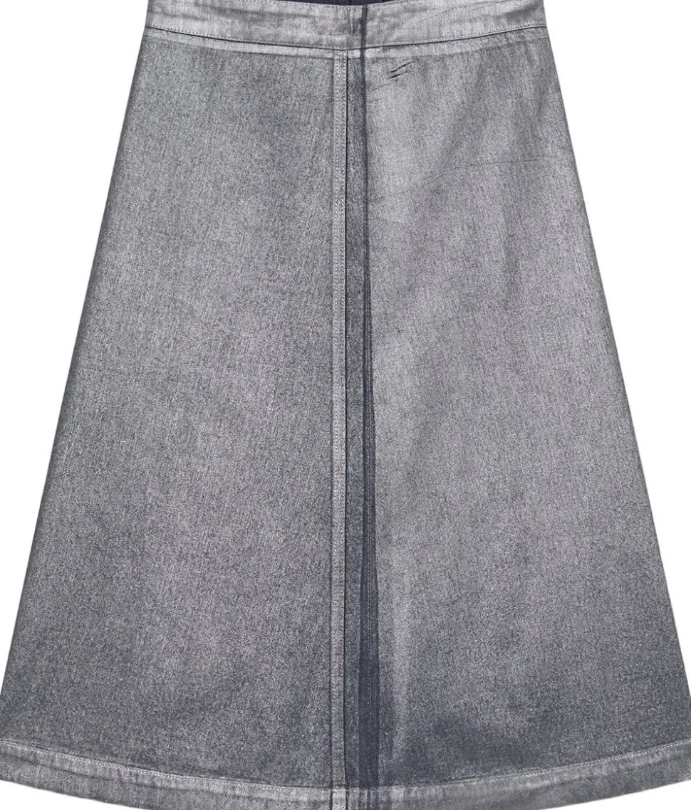 A-formet, læglang og let denimnederdel med høj talje, lommer og fast linning med lynlås bagpå.