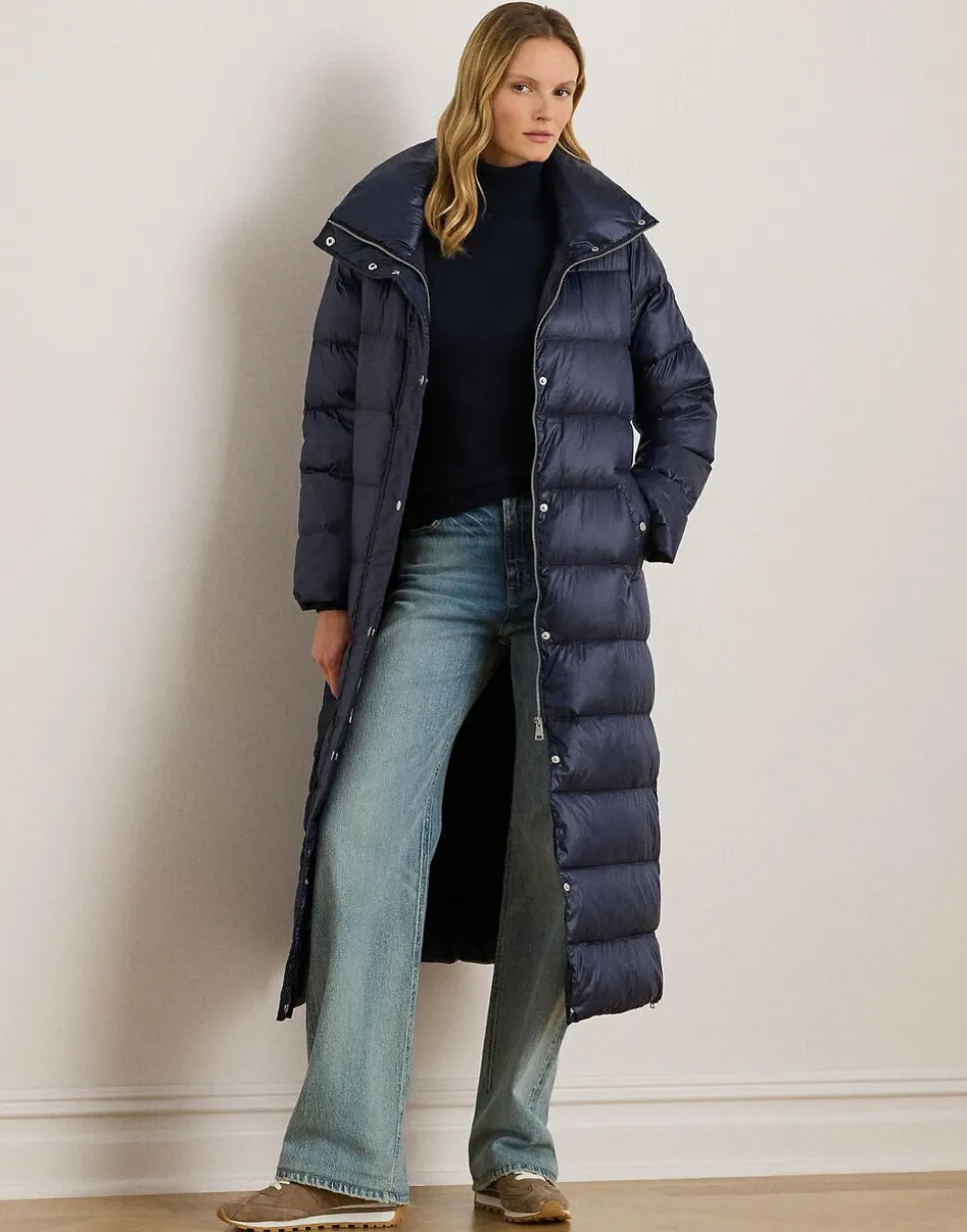 Denne maxi-frakke er fyldt med 650-fyld-dun, har en metallisk finish, en voluminøs skorstenshals og kanalquiltning, hvilket skaber en stil, der er både praktisk og smart