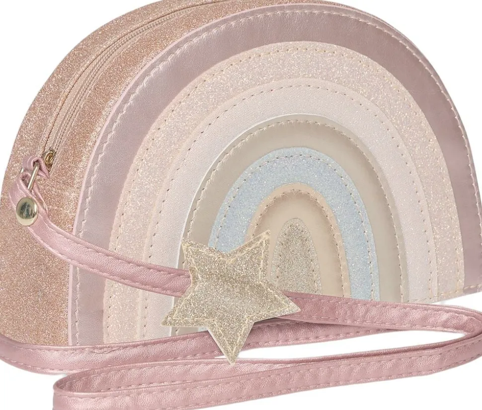 Halvmåneformet taske med en skinnende lyserød regnbue og en glitrende stjerne på remmen. 1 rum og lynlås. Stroplængde 48 cm.