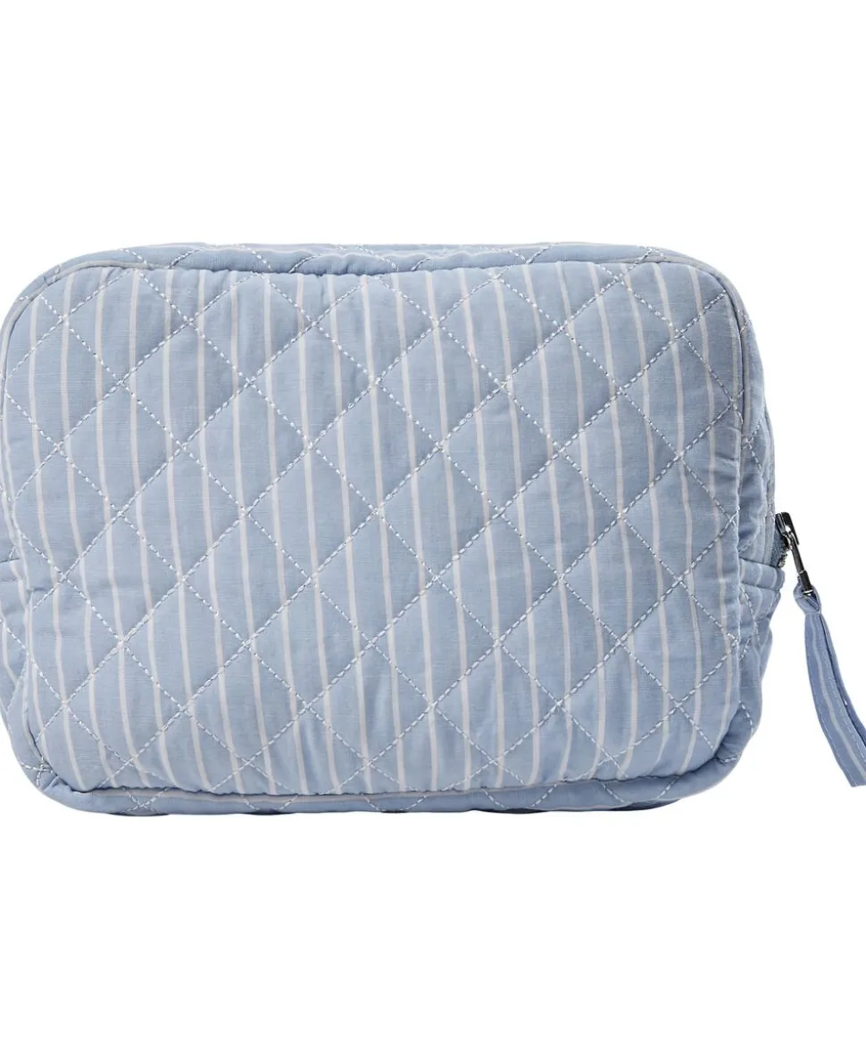 Toilettaske fra Magasin du Nord Collection i den blødeste kvalitet af 80% økologisk bomuld med GOTS-certificering. Toilettasken består af ét stort rum med lynlåslukning samt mindre inderlommer. Derudover har toilettasken fine vatterede syningsdetaljer og et stribet print. En skøn toilettaske i den lækreste kvalitet.