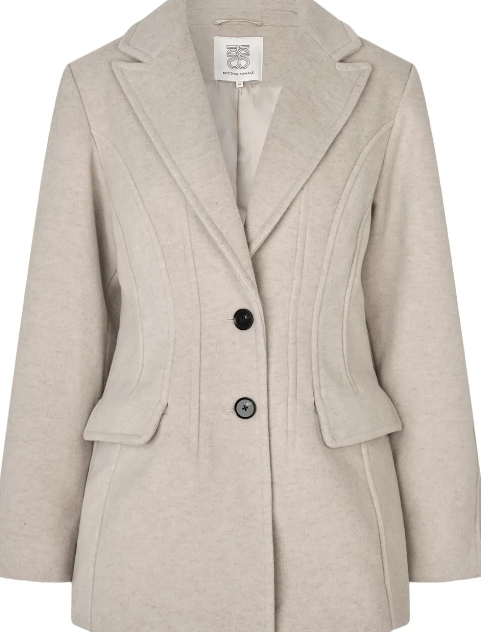 Second Female figursyet blazer. Blazeren er fremstillet i en tyk uldblanding. Toprevers og knaplukning. Stikningsdetaljer foran og bagpå. To påsyede lommer. Vatterede skuldre og lange ærmer. Fittede s
