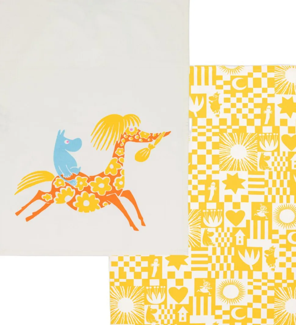 Få sommerstemning i køkkenet! Festkollektionens legende mønstre er baseret på tidlige mumimønstre fra 1950’erne med mange sjove elementer. Tilbered et lækkert måltid i stil med de livsglade mumier, og inviter dine nærmeste med til festen! Moomin Arabia-viskestykkesæt 50×70, gul, Fest GOTS