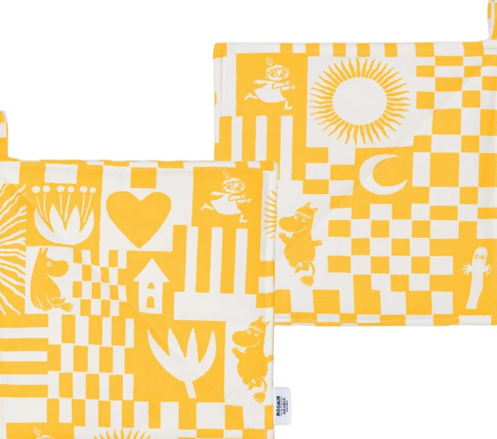 Få sommerstemning i køkkenet! Festkollektionens legende mønstre er baseret på tidlige mumimønstre fra 1950’erne med mange sjove elementer. Tilbered et lækkert måltid i stil med de livsglade mumier, og inviter dine nærmeste med til festen! Moomin Arabia-grydelapsæt, gul, Fest