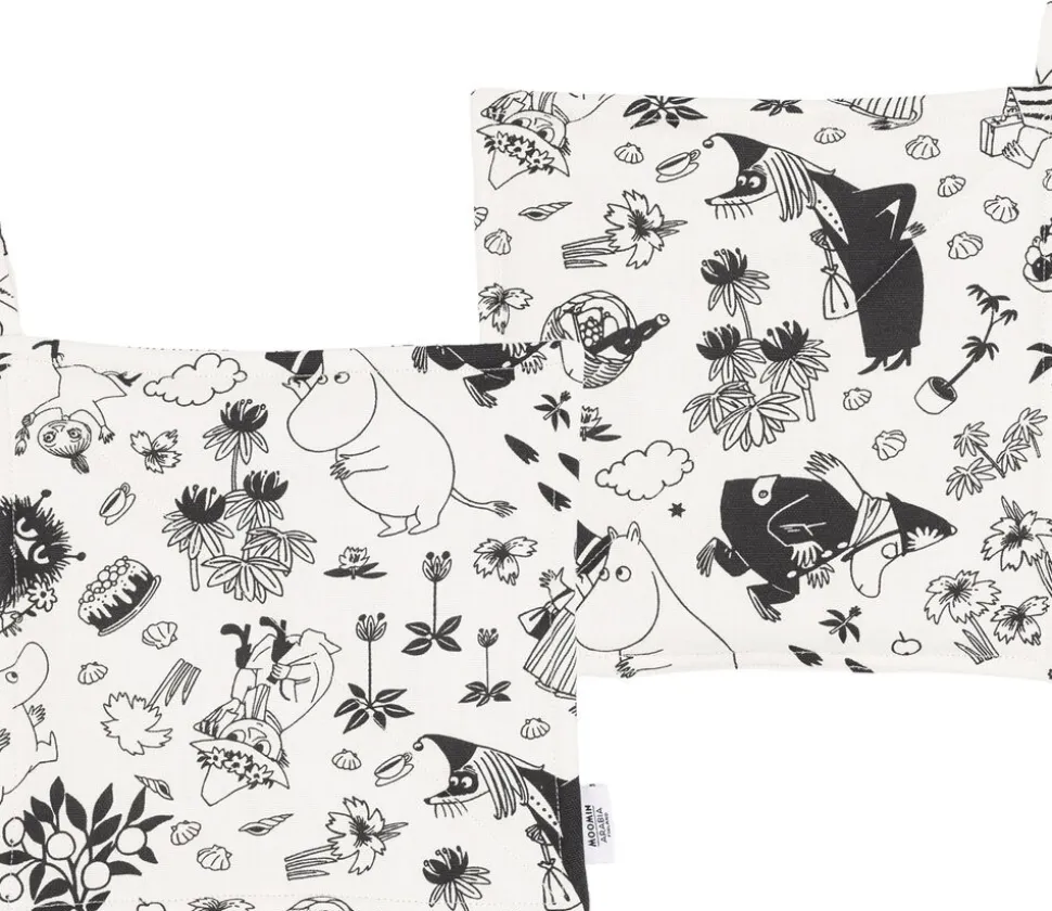 Mumitroldene holder fest, og det er tid til at nyde alle slags lækkerier! Mumitroldenes køkkenprodukter er velegnede til både hverdagsbrug og festlige lejligheder. Den afdæmpede sorte og beige farve med det velkendte Mumidalen-mønster. Moomin Arabia grydelap sæt i off-white, 2 stk.