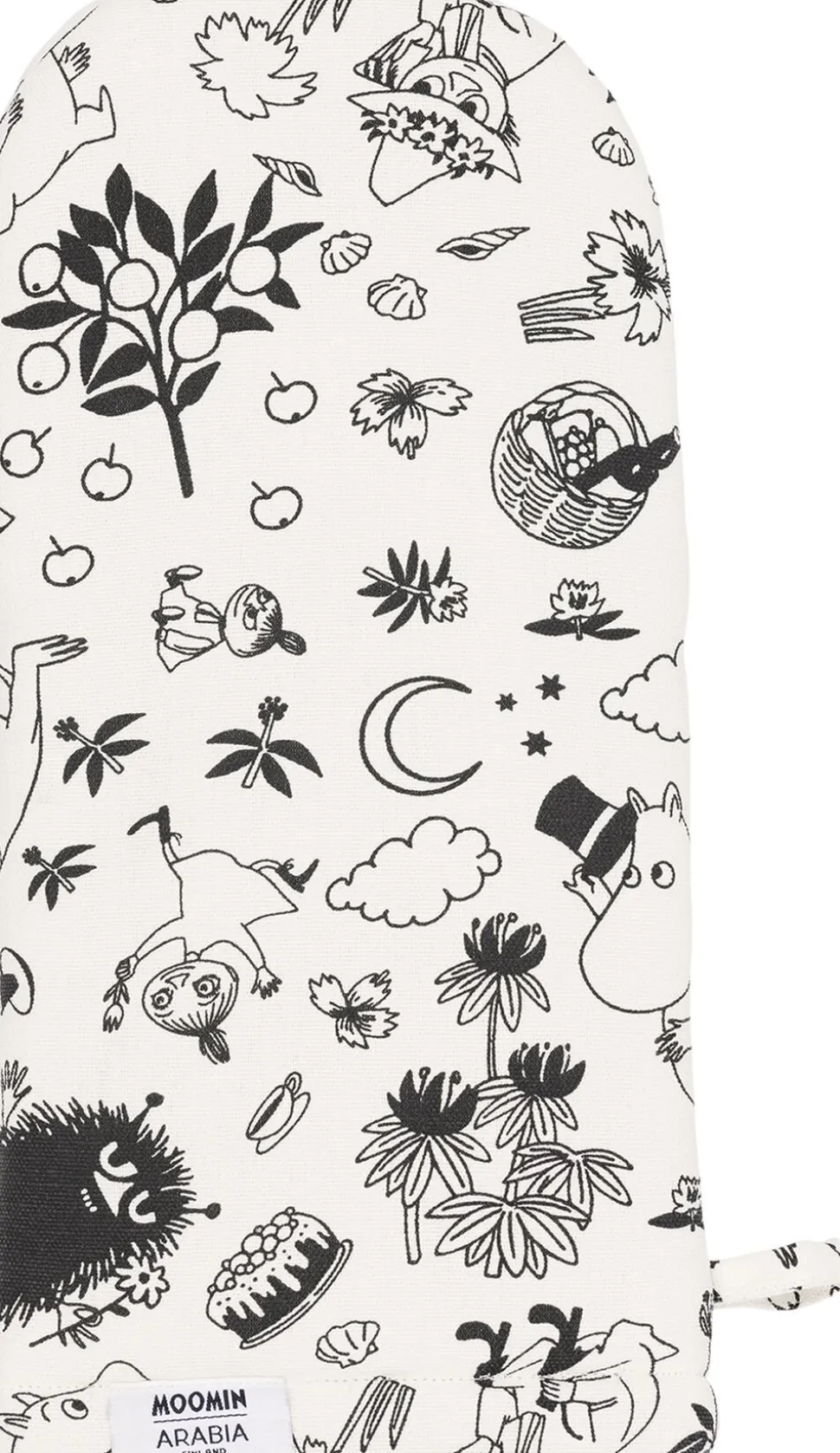 Mumitroldene holder fest, og det er tid til at nyde alle slags lækkerier! Mumitroldenes køkkentekstiler er velegnede til både hverdagsbrug og til festlige lejligheder. Den afdæmpede sorte og beige mønster præsenterer de velkendte figurer fra Mumidalen. Moomin Arabia ovnhandske i off-white.