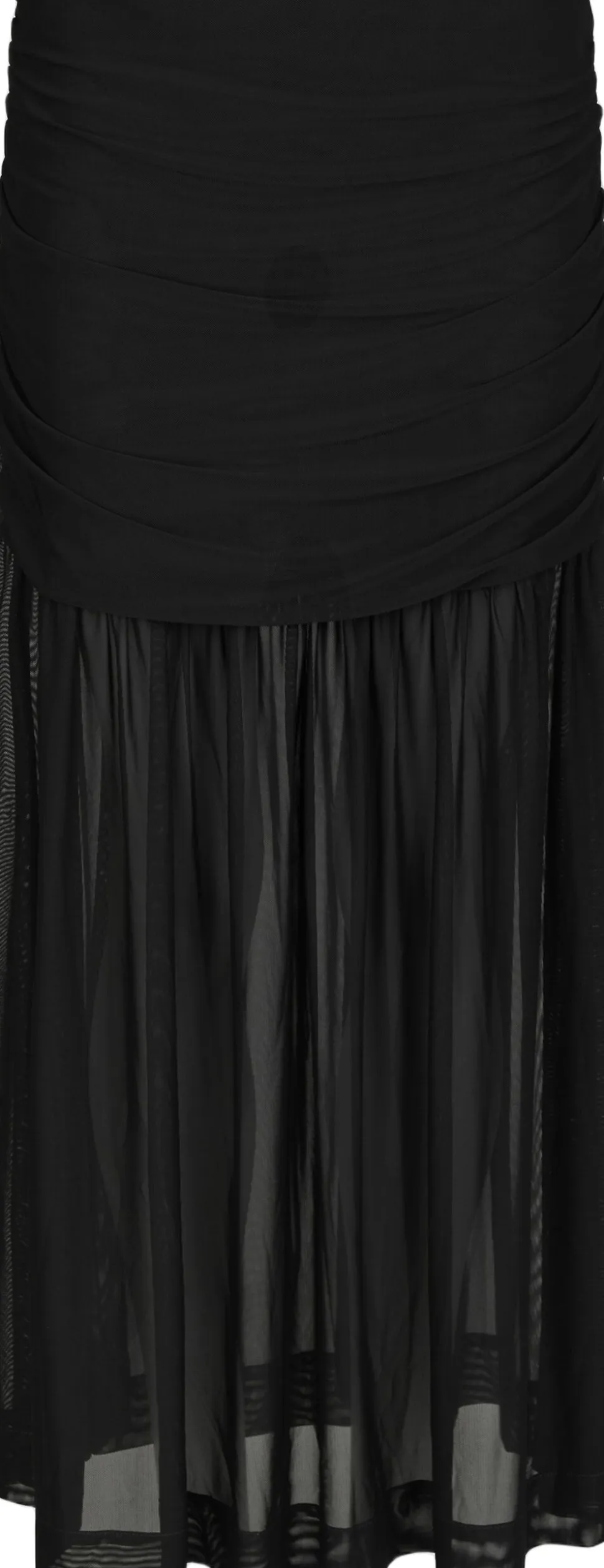 Maxinederdel i mesh. Nederdelens øverste stykke er tætsiddende og draperet, mens det nederste er designet med vidde. Den har elastik i taljen og et kort, påsyet underskørt. Pasformen er almindelig. Modellen er iført størrelse 36.
