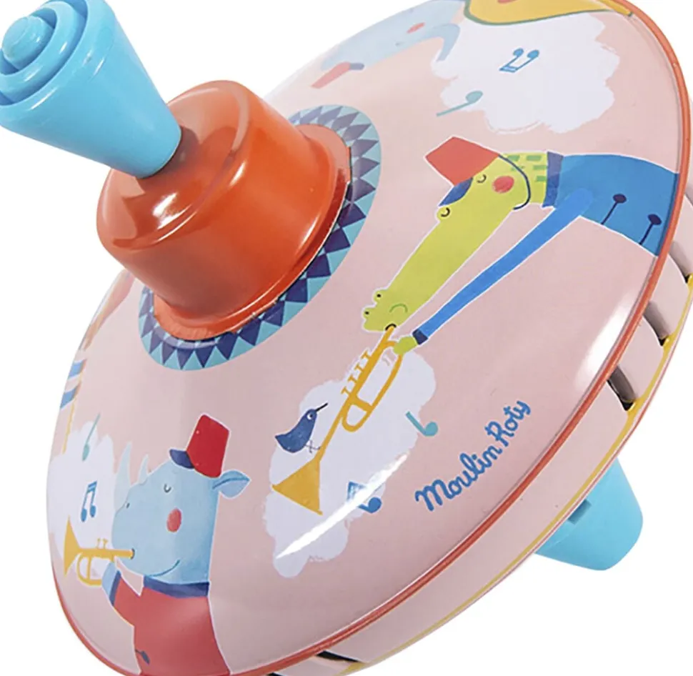 Lille, lyserød snurretop i metal med illustration af et musikoptog med glade dyr i mange farver!