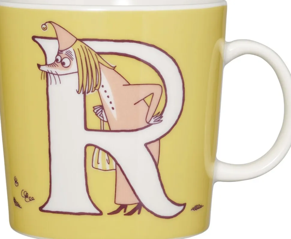 R-kruset har Fillyjonk, der ser bekymret på støvskyerne og stiller spørgsmålstegn ved, hvordan Moomin-familien kan leve under sådanne forhold. Moominmamma og Moominpappa er midt i en større rengøring, som går imod deres sædvanlige vaner. Fillyjonks børn observerer moomins ‘plejeproces med interesse. Dette Moomin Arabia-krus har en kapacitet på 0,4 liter og er mærket ABC R