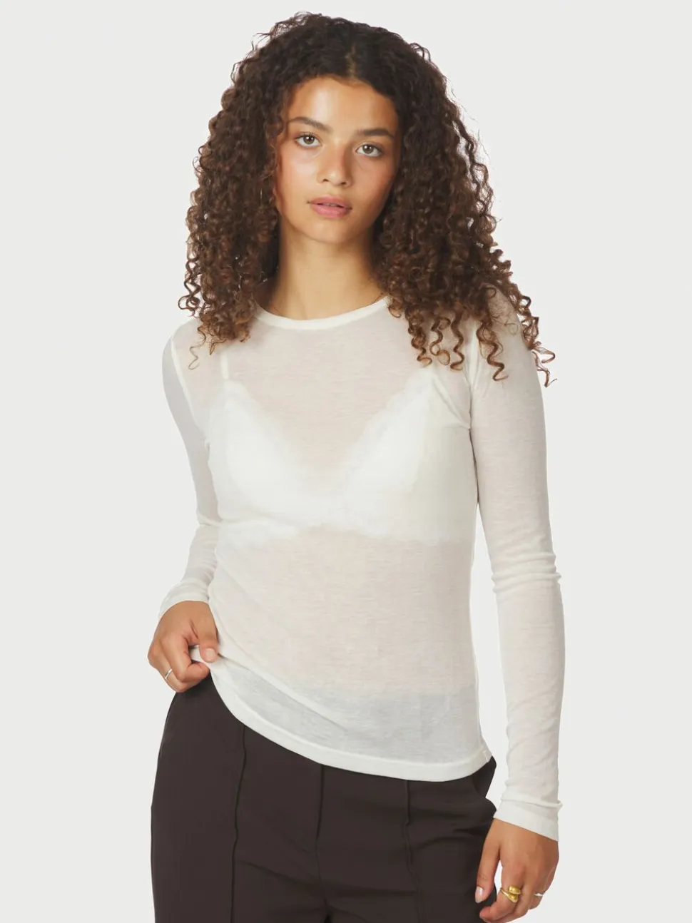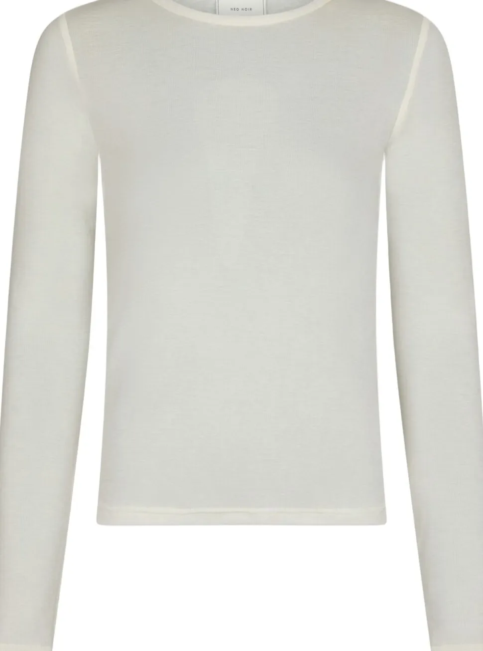 Langærmet bluse i en blød ribkvalitet. Blusen har en rund halsudskæring og en tætsiddende pasform. Den er lavet i en blød lyocell- og uldblanding. Modellen er iført størrelse 36.