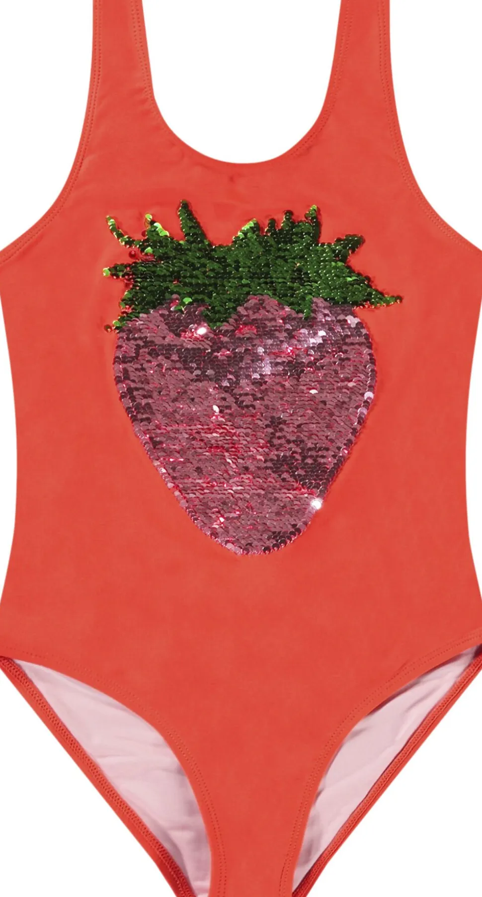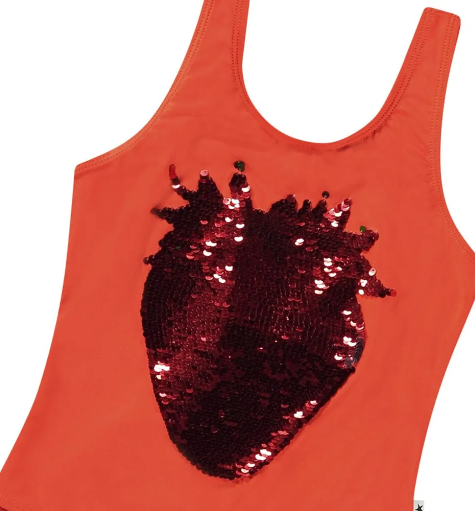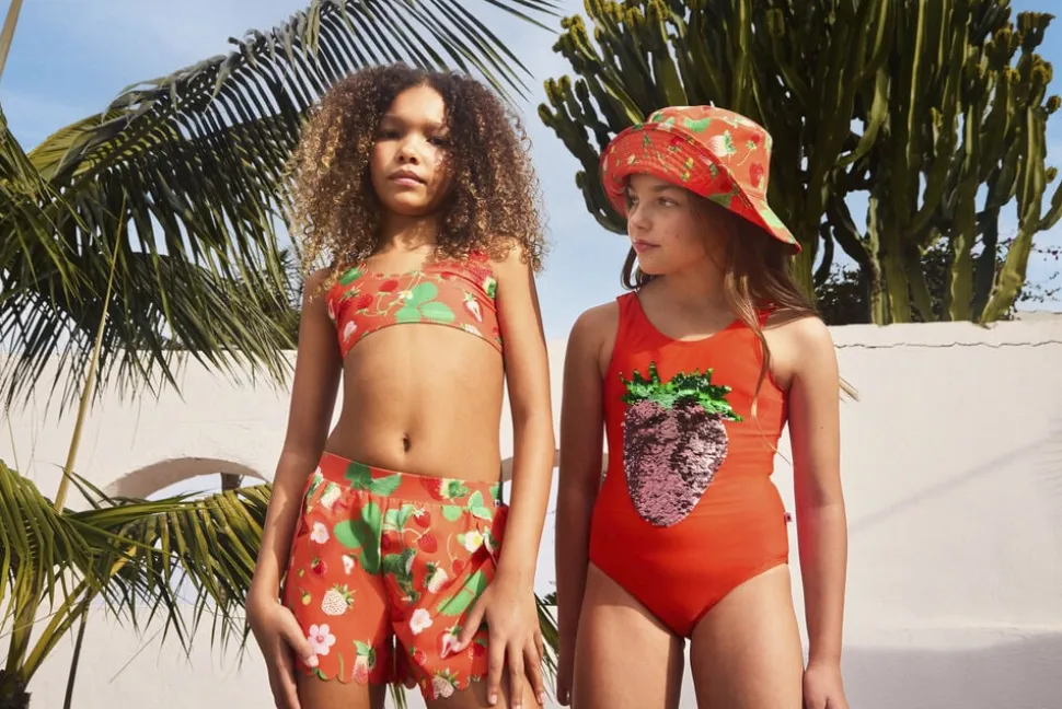 Lyserød badedragt med smilende smiley-print på forsiden. Lavet af genanvendt, elastisk polyester for komfort og nem påklædning. Med en høj UV-beskyttelse på 50+ er den ideel til solbeskyttelse.