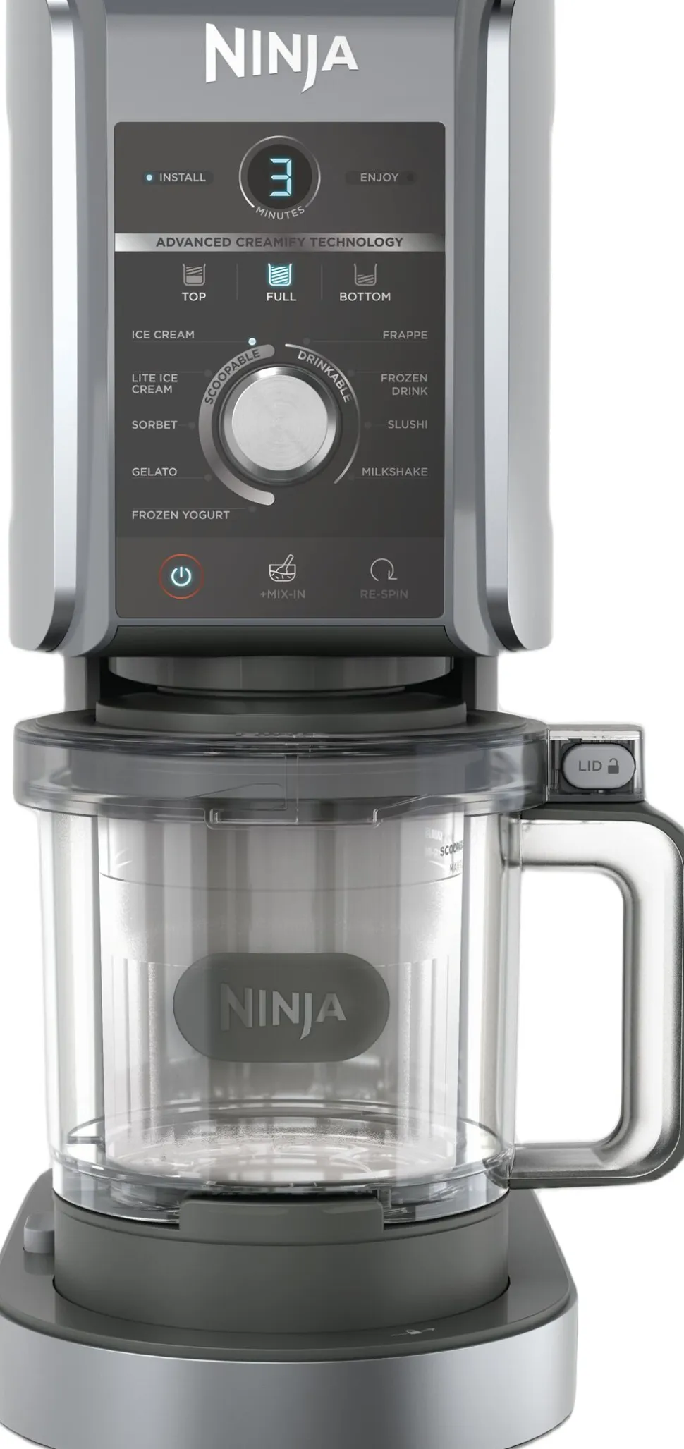 NINJA CREAMI DELUXE 10-IN-1 ICE CREAM AND FROZEN DRINK MAKER NC502EU Oplev uendelige muligheder med Ninja CREAMi Deluxe din personlige is- og frozen drinkmaskine med 10 smarte programmer: Is, Sorbet, Light is, Gelato, Milkshake, Mix-In, Frappe, Frozen Drink, Slushi og Frozen Yoghurt. Med Advanced CREAMify Technology og to kraftige motorer forvandler maskinen frosne ingredienser til cremede desserter og forfriskende drikke på få minutter. Vælg selv tekstur med ReSpin-funktionen. De medfølgende 2 Deluxe-beholdere rummer hver 706 ml 50 % mere end originalen så der er nok til at dele. Lav to smagsvarianter i én beholder med Top/Bottom-indstillingerne. Velegnet til veganske, sukkerfri og laktosefri opskrifter. Mix-In-funktionen gør det nemt at tilføje nødder, frugt eller chokolade. Let at rengøre: Alle aftagelige dele kan sættes i opvaskemaskinen.