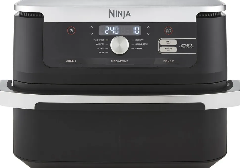 Ninja Foodi FlexDrawer, den ekstra store kapacitets-airfryer, der tilpasser sig ethvert måltid. LAV MAD I 2 UAFHÆNGIGE MADLAVNINGSZONER med Ninjas karakteristiske Dual Zone Technology, eller fjern opdelingen for at tilberede større fødevarer i den 10,4L MegaZone. Du kan både Airfry, Max Crisp, stege, hæve, bage og genopvarme. Ninjas karakteristiske Dual Zone Technology giver dig mulighed for at bruge 2 forskellige madlavningsfunktioner, tider og temperaturer i hver zone – begge slutter madlavningen på samme tid! Du kan nyde frisktilberedte hovedretter og tilbehør sammen med SYNC-funktionen – du behøver ikke at bruge forskellige apparater eller lade dit tilbehør blive koldt, mens din hovedret tilberedes! Du kan også bruge MATCH-funktionen til at kopiere de samme indstillinger på tværs af begge zoner. Hver 5,2L zone kan rumme op til en 2 kg kylling eller op til 1,5 kg pommes frites. MED DEN EKSTRA STORE 10,4L MEGAZONE kan du nu nyde masser af plads til at få plads til de større fødevarer, som du normalt ville tilberede i ovnen. Fjern blot opdelingen for at omdanne 2 zoner til én stor madlavningsskuffe. Passer let en hel 2 kg lammekølle med stegte grøntsager. Lav hurtigt lækre måltider til 8+ personer Op til 65% hurtigere end almindelige ovne*, kan du have et komplet måltid klar på under halvdelen af tiden. *Testet op imod fiskefingre og pølser.
