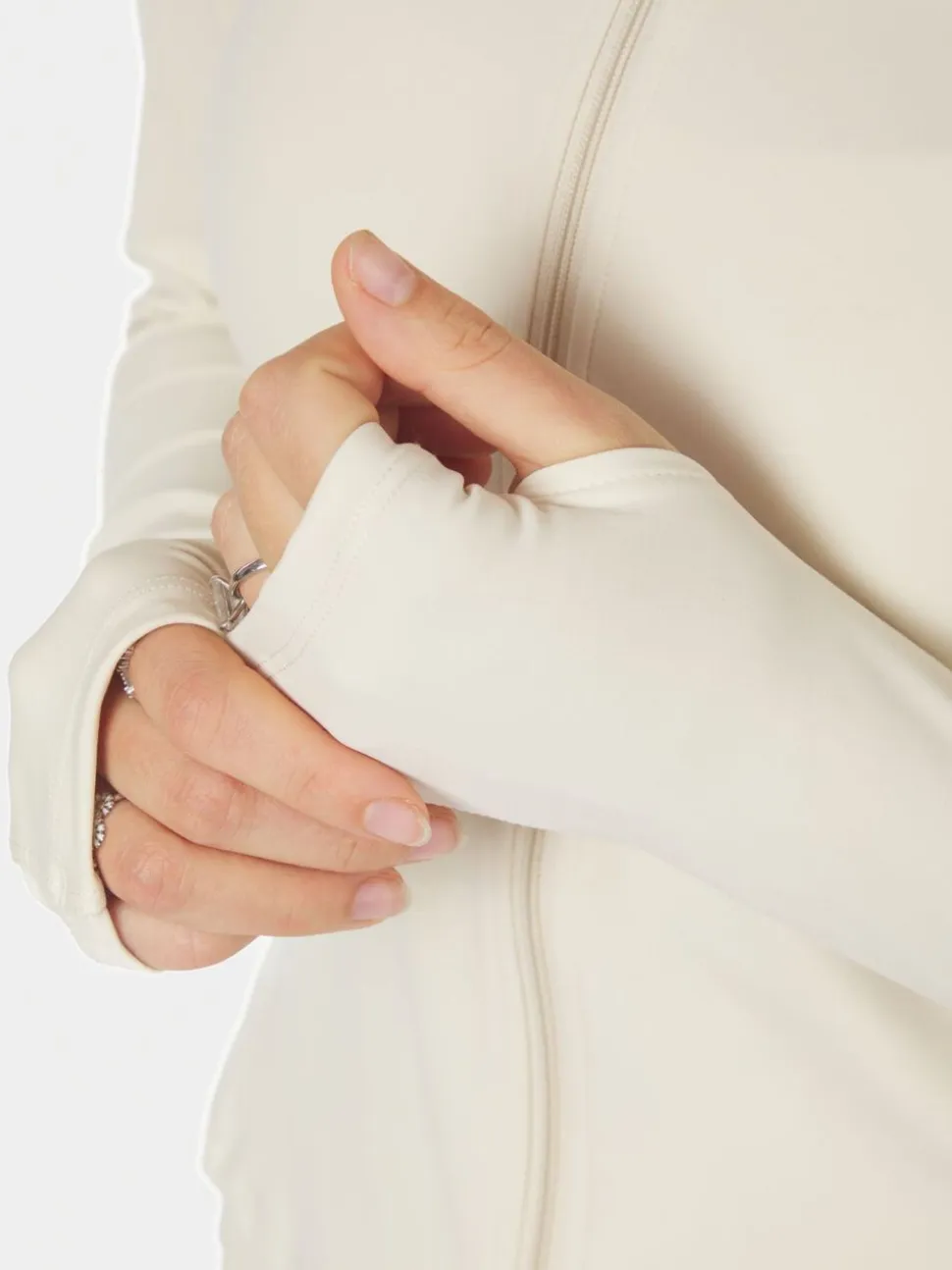 Langærmet bluse med lynlåslukning foran. Blusen har høj hals, ærmer med hul til tommelfingeren og en tætsiddende pasform. Den er lavet i et strækbart materiale. Modellen er iført størrelse 36.