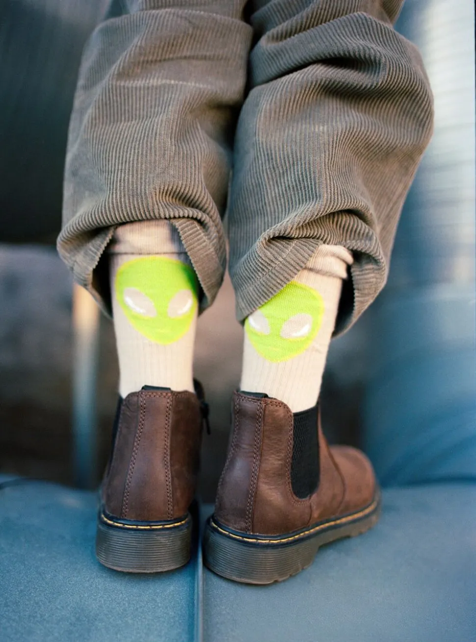 2-pak strømper fra Molo i blødt bomuld med ribbet skaft og elastik foroven. Pakken indeholder et par sorte strømper og et par grå strømper, begge med printede alien hoveder bagpå.