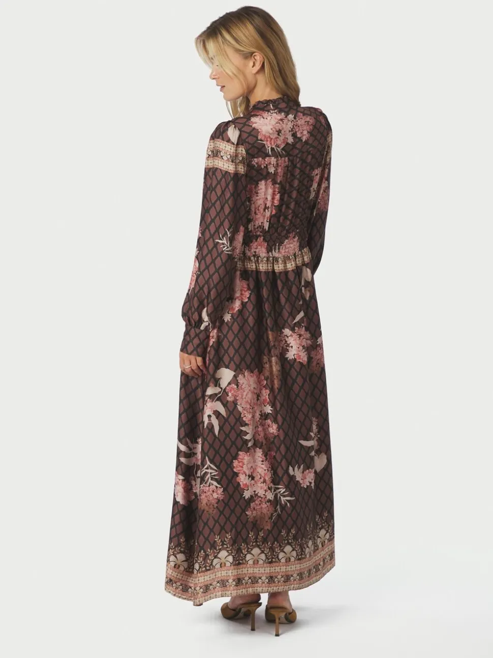 Maxi kjole med blomsterrint. Kjolen har en V-udskæring med en lille krave, lange pufærmer med tætsiddende manchetterbog lukkes med knapper langs fronten. Den har en almindelig pasform. Modellen er iført størrelse 36.