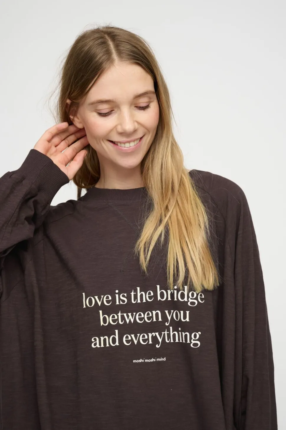 Påtrykt tekst: “love is the bridge between you and everything” ??