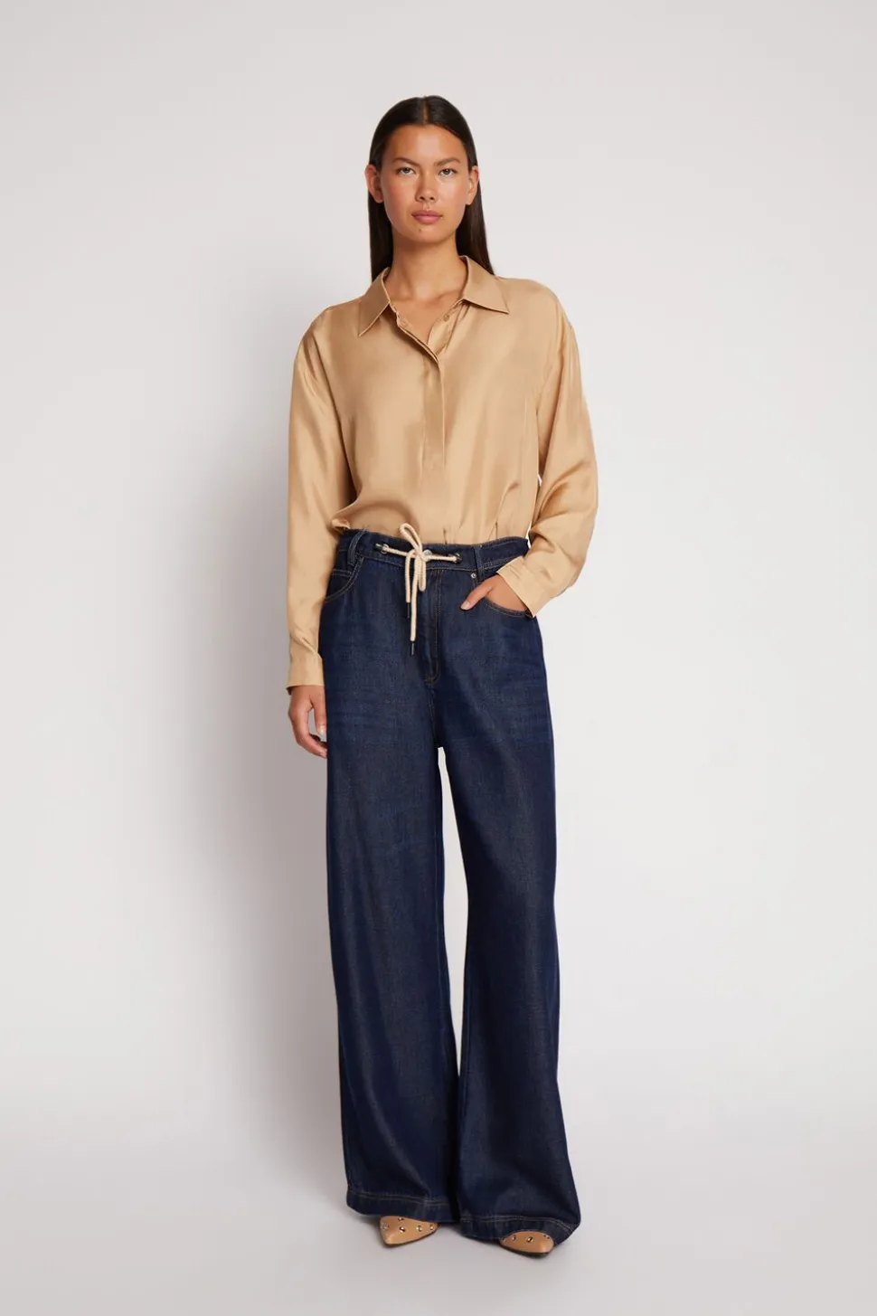 Mørkeblå jeans, designet med en elegant snøre detalje i taljen. Disse bukser har en løs pasform, brede ben og har lommer foran og bagpå.