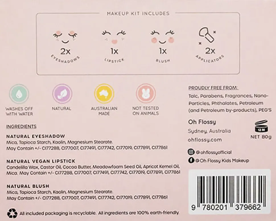Indhold: 2 x applikatorer, 1 x pastel pink blush, 1 x pink læbestift i krukke, 2 x øjenskygger