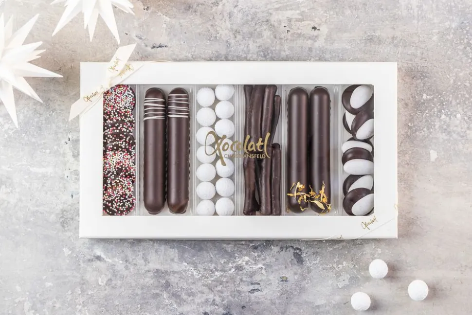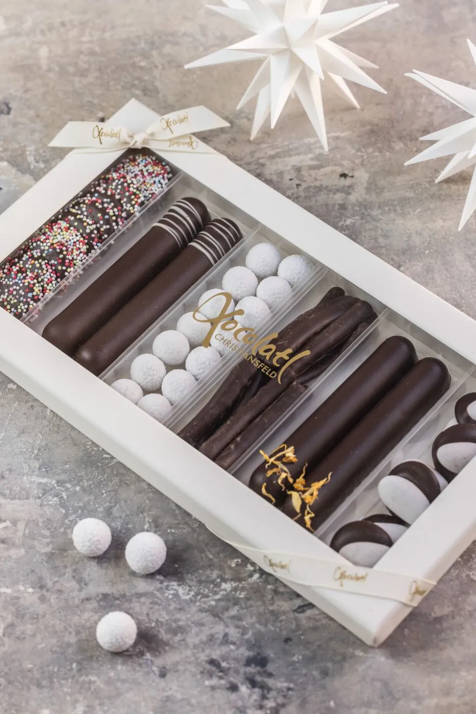 mintkaramel, orangegrene, snebolde med hasselnødder og mørk chokolade