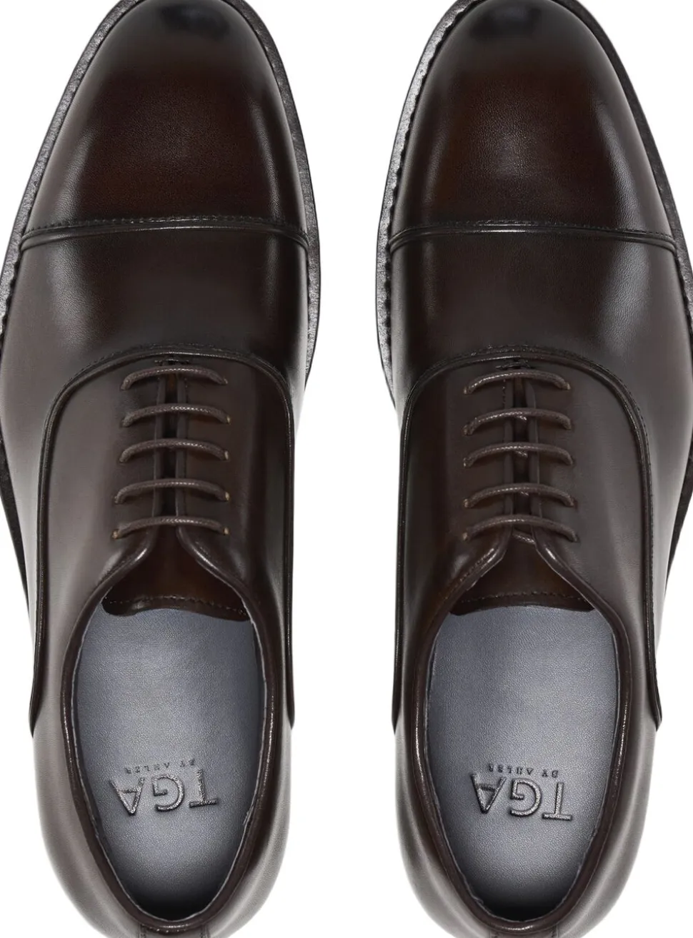 Oxford-sko med tåkappe i vokset kalvelæder. Læderfor og fuldt polstret læglæderindersål. Ydersål i gummi