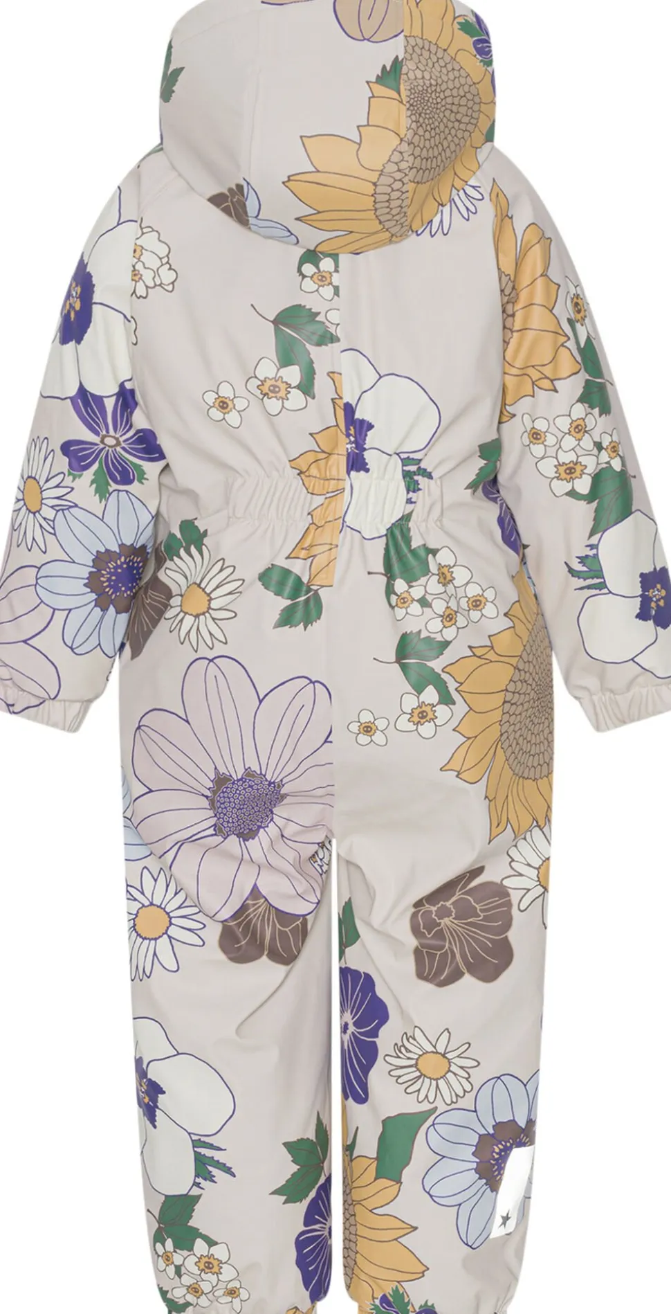 Fin, rosa flyverdragt af naturgummi med flot, farverigt blomsterprint på både forside og bagside. Paco-flyverdragten er en del af Molos nye overtøjskollektion ‘Rubber Excellence’, som byder på alt hvad barnet har brug for, for at holdes tør og varm i alt slags vejr. Flyverdragten er både vind- og vandtæt, samt åndbar til en hvis grad. Overfladen er blød og smudsafvisende og kan nemt rengøres, når den bliver mudret til. Paco-dragten er godt isoleret, har lækkert fleecefor og fungerer fint til moderat kolde vintre. Den lukkes med lynlås på fronten, har elastikkant ved ærmer og ben samt aftagelige gummistropper ved fødderne. Refleksdetaljer sikrer bedre synlighed i trafikken. Vandsøjletryk: 8.000mm. Åndbarhed: 3.000 g/m2/24t. Ydermateriale, for, samt inderstof er fremstillet delvist af naturgummi og delvist af genanvendt polyester fra brugte plastikflasker og andet restaffald. Herved bruges der langt færre ressourcer samt en væsentlig mindre udledning af CO2. Miljøvenlig vand- og smudsafvisende coating uden brug af kemikalier som PFOS, PFOA og lignende.